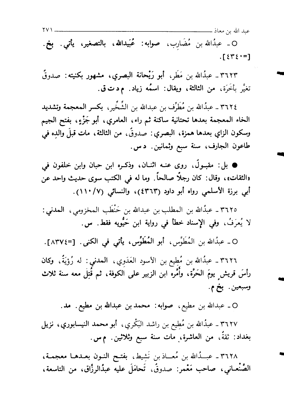 3627 - عبدُ الله بن مُطِيع بن راشد البَكْري، أبو محمد النيسابوري، نزيل بغداد: ثقةٌ، من العاشرة، مات سنة سبع وثلاثين. م س.
