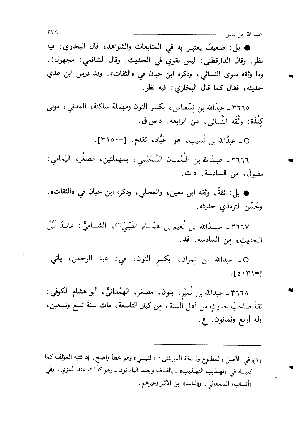 3668 - عبد الله بن نُمَيْرٍ، بنون، مصغر، الهمْدانيُّ، أبو هشام الكوفي: ثقةٌ صاحبُ حديثٍ من أهل السنة، مِن كبار التاسعة، مات سنةَ تسع وتسعين، وله أربع وثمانون. ع.