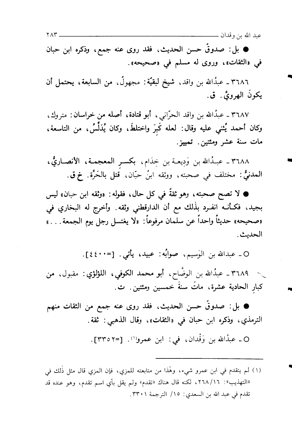 3686 - عبدُ الله بن واقد، شيخ لبقية: مجهولٌ، من السابعة، يحتمل أن يكونَ الهرويَّ. ق.
