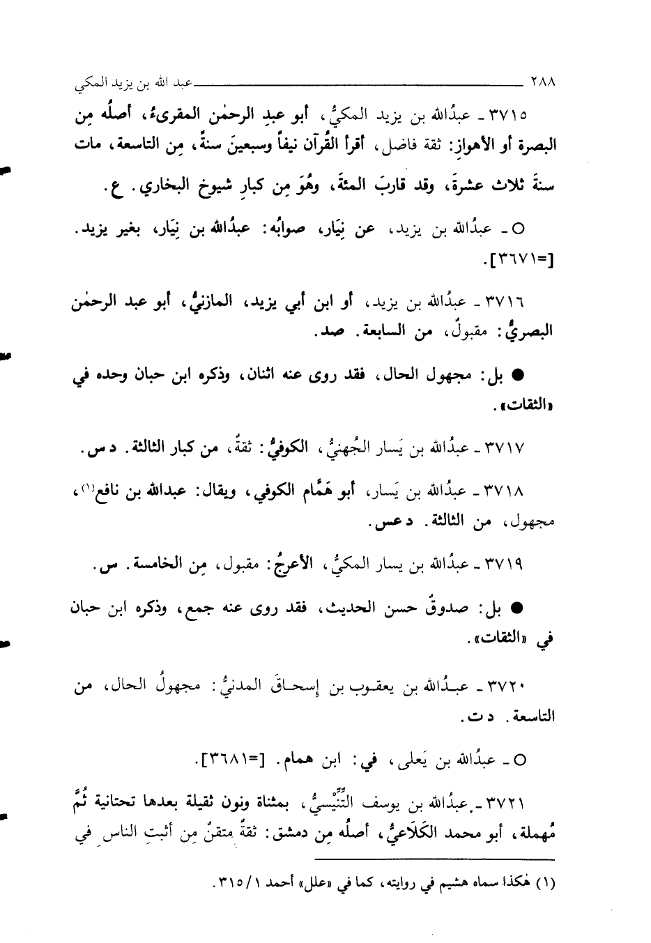 3721 - عبدُ الله بن يوسف التِّنِّيْسي، بمثناة ونون ثقيلة بعدها تحتانية ثُمَّ مُهملة، أبو محمَّد الكَلَاعي، أصلُه مِن دمشق: ثقةٌ متقنٌ مِن أثبتِ الناسِ في