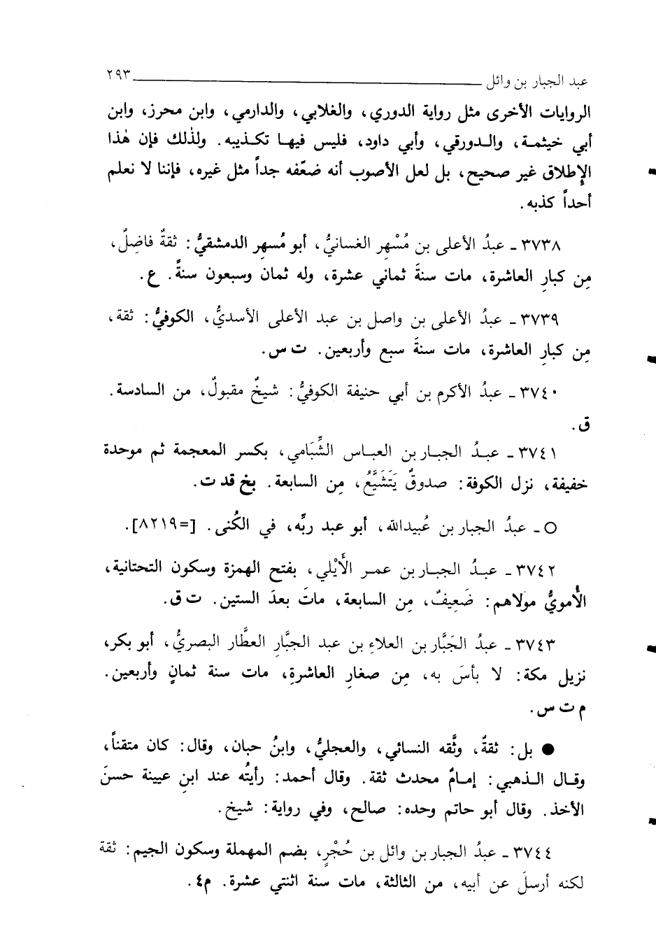 3743 - عبدُ الجَبار بن العلاءِ بن عبد الجبارِ العطَّار البصريُّ، أبو بكر، نزيل مكة: لا بأس به، مِن صغارِ العاشرةِ، مات سنة ثمانٍ وأربعين. م ت س.