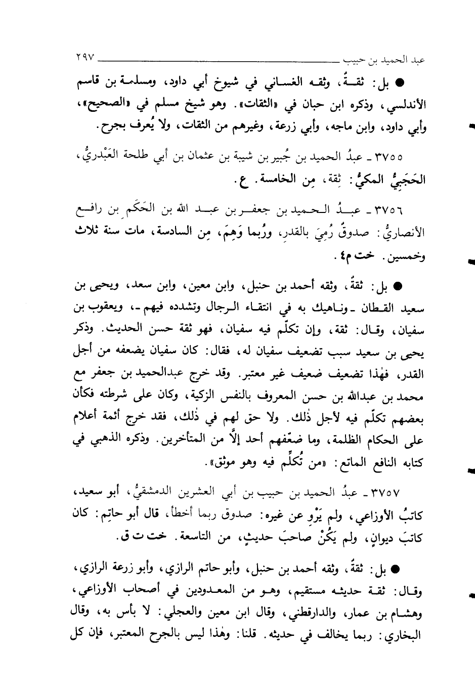 3756 - عبدُ الحميد بن جعفر بن عبد الله بن الحَكَمِ بن رافع الأنصاريُّ: صدوق رُمِيَ بالقدرِ، ورُبما وَهِمَ، مِن السادسة، مات سنة ثلاث وخمسين. خت م 4.