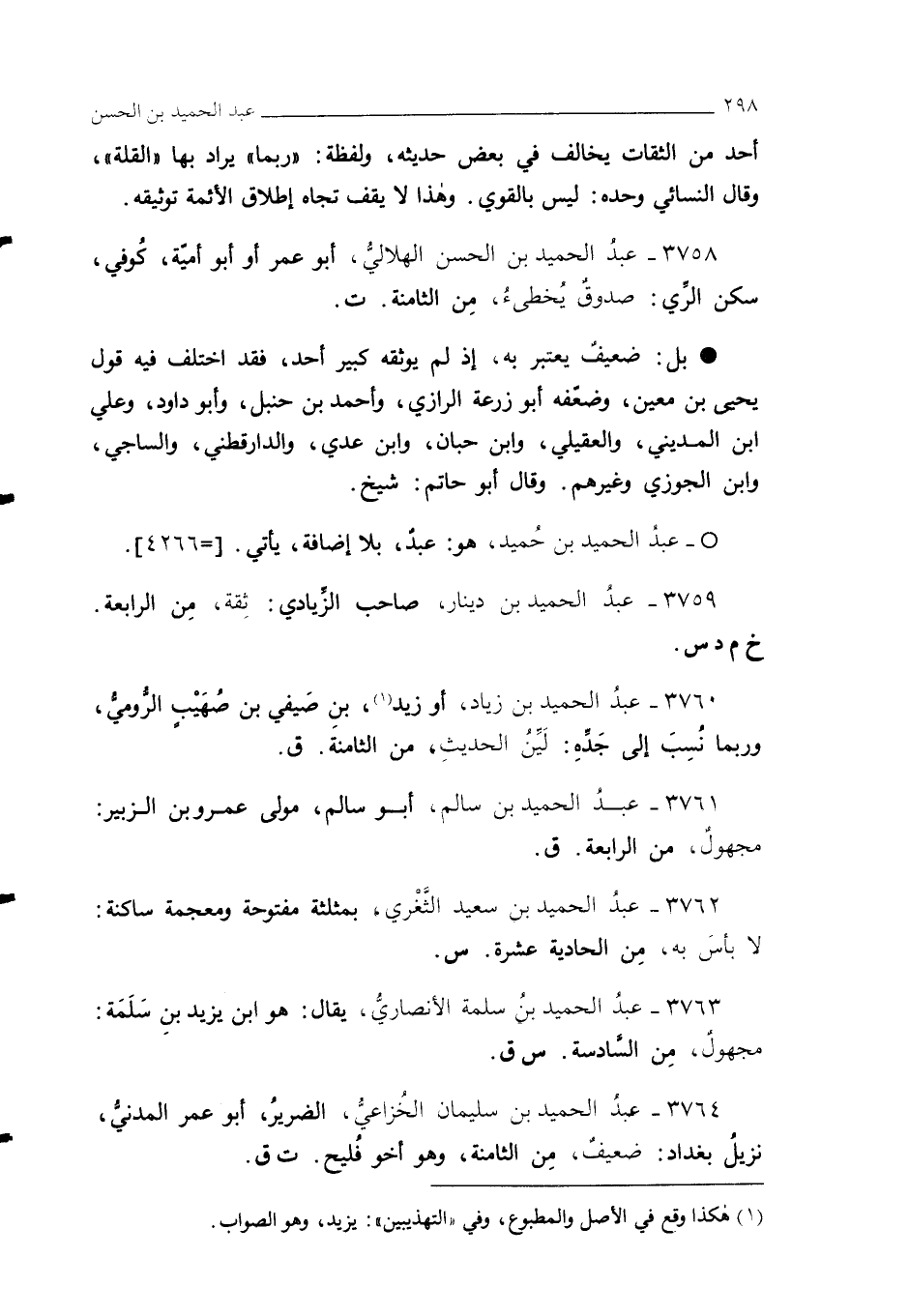 3758 - عبدُ الحميد بن الحسن الهلاليُّ، أبو عمر أو أبو أمية، كُوفي، سكن الري: صدوق يُخطئُ، مِن الثامنة. ت.