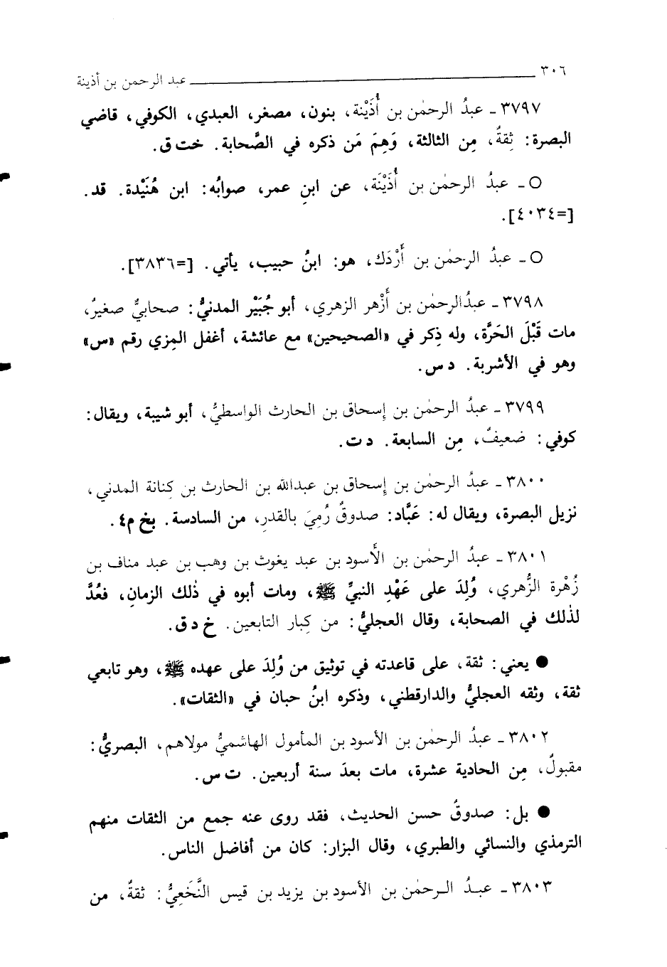 3797 - عبدُ الرحمن بن أُذَيْنة، بنون، مصغر، العبدي، الكوفي، قاضي البصرة: ثِقةٌ، مِن الثالثة، وَهِمَ مَن ذكره في الصَّحابة. خت ق.