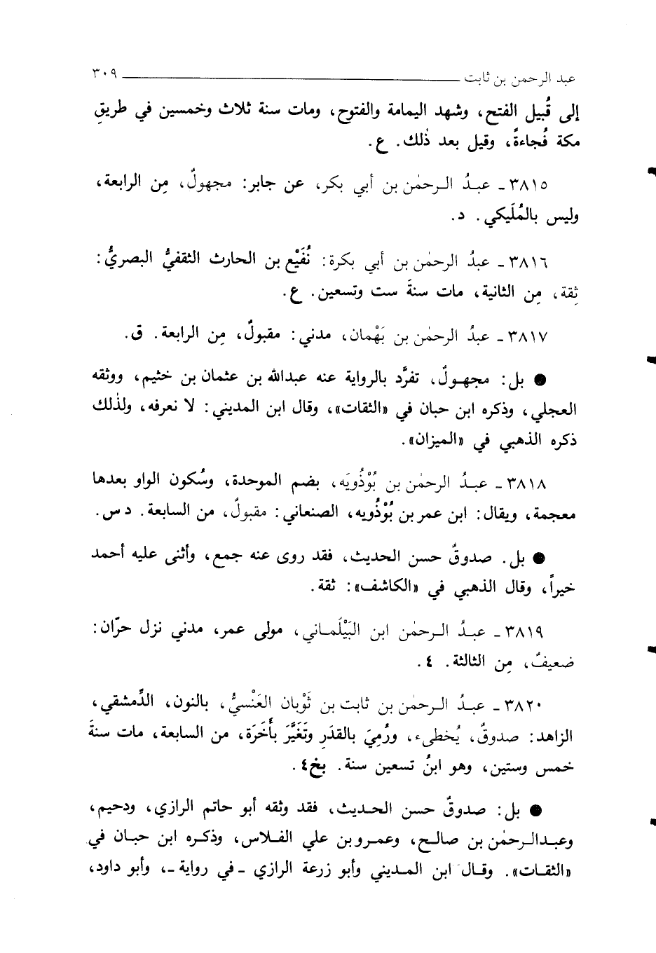 3820 - عبدُ الرحمن بن ثابت بن ثَوْبان العَنْسيُّ، بالنون، الدِّمشقي، الزاهد: صدوقٌ، يُخطئ، ورُمِيَ بالقدَرِ وتَغَيَّرَ بأَخَرَة، من السابعة، مات سنةَ خمس وستين، وهو ابنُ تسعين سنة. بخ 4.