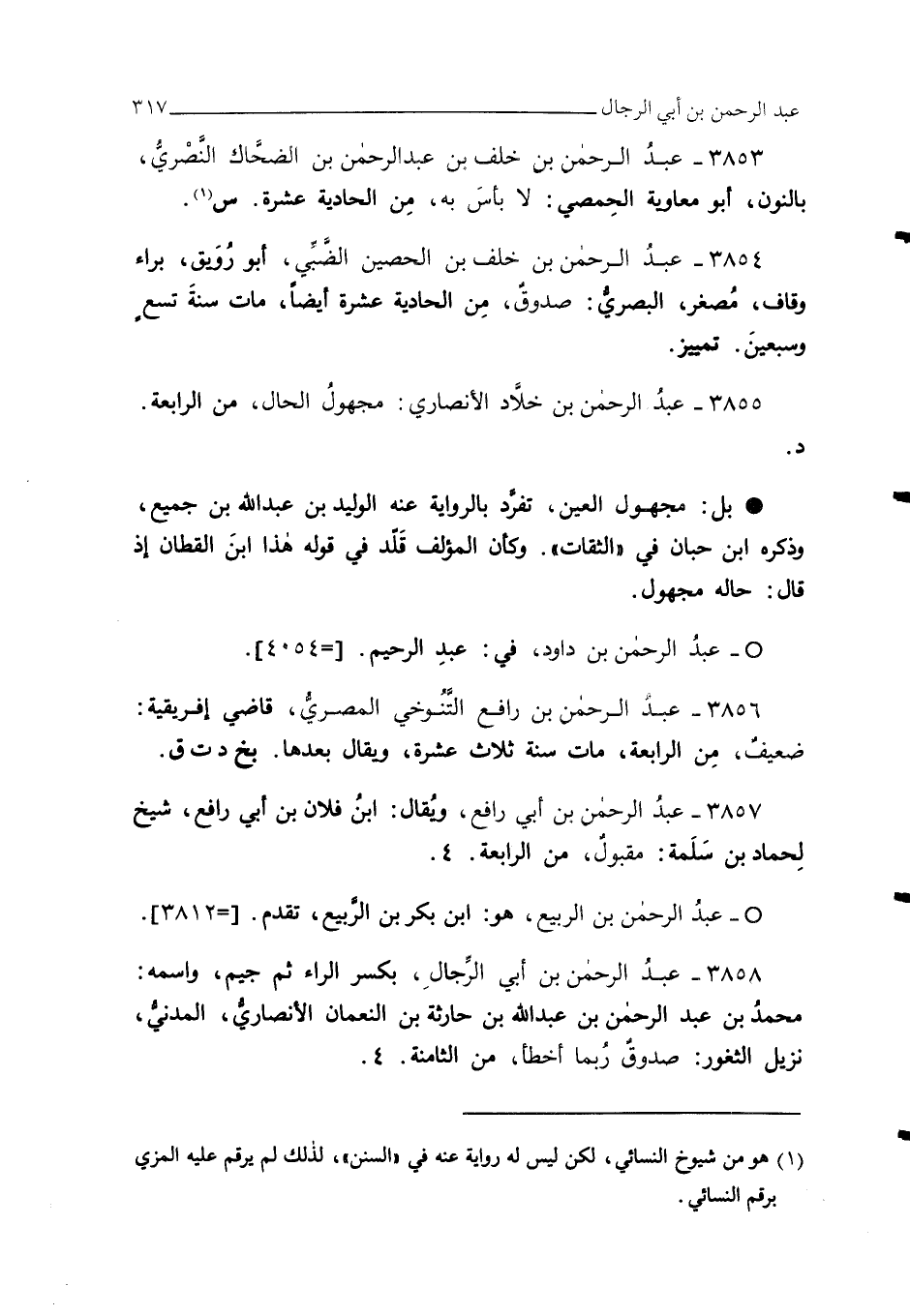 3857 - عبدُ الرحمن بن أبي رافع، ويُقال: ابنُ فلان بن أبي رافع، شيخ لِحماد بن سَلَمة: مقبولٌ، من الرابعة. 4.