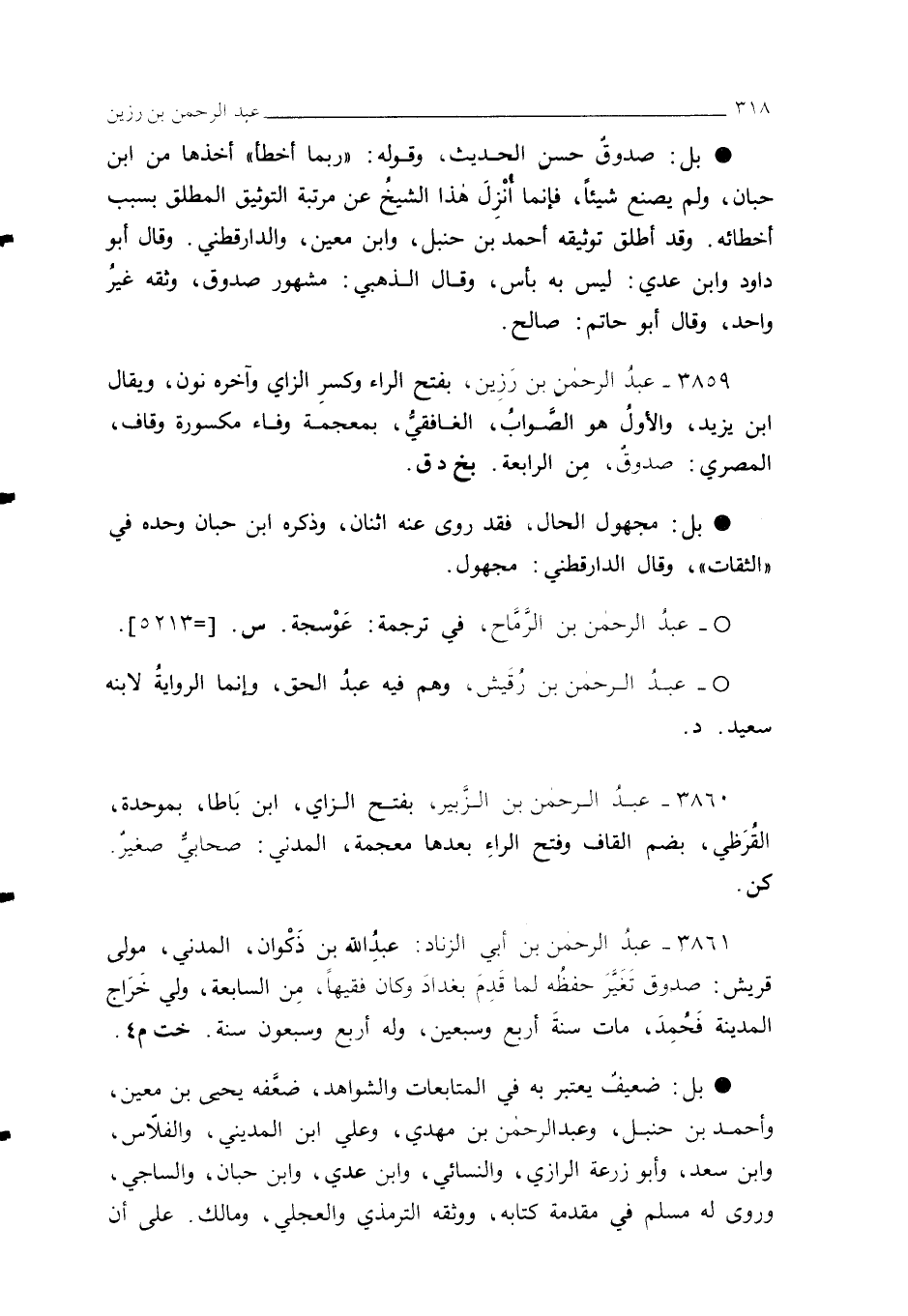 3859 - عبدُ الرحمن بن رَزِين، بفتح الراء وكسرِ الزاي وآخره نون، ويقال ابن يزيد، والأولُ هو الصَّوابُ، الغافقيُّ، بمعجمة وفاء مكسورة وقاف، المصري: صدوقٌ، مِن الرابعة. بخ د ق.