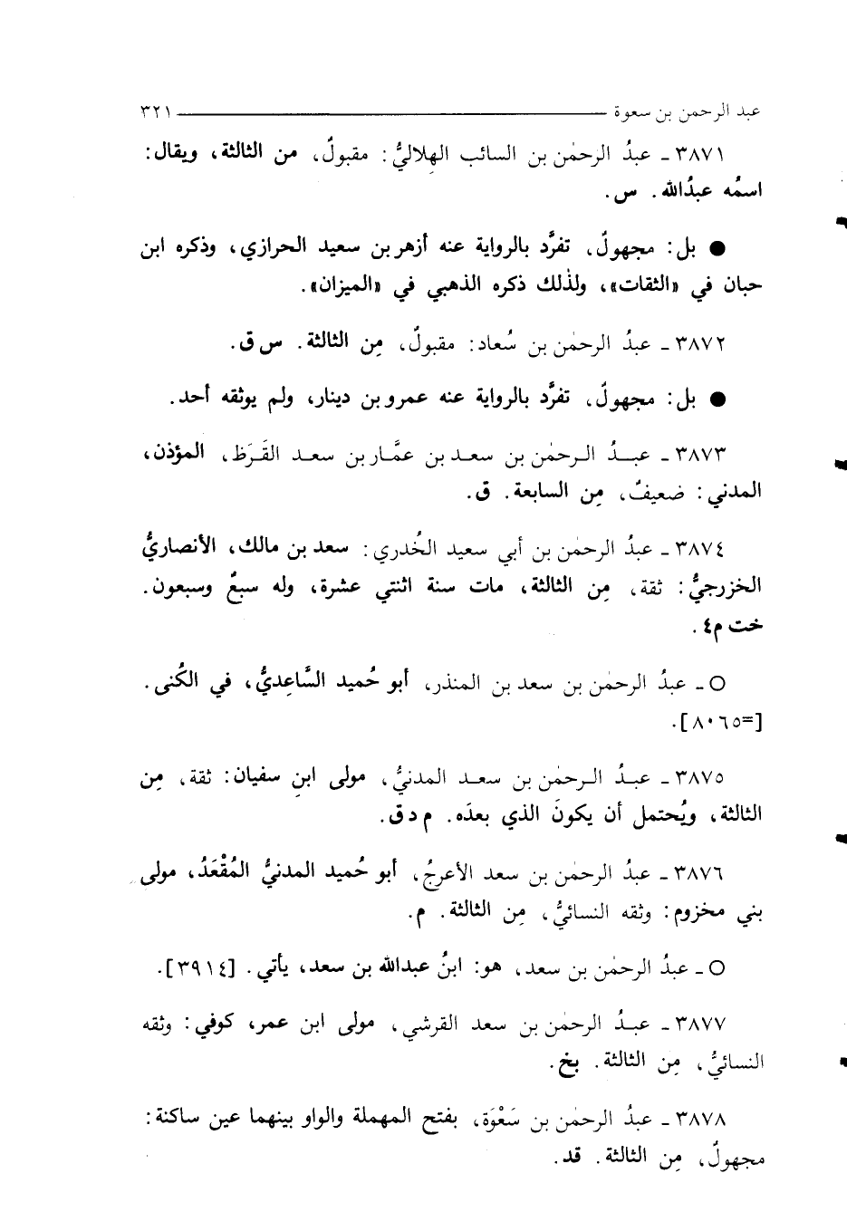 3875 - عبدُ الرحمن بن سعد المدنيُّ، مولى ابنِ سفيان: ثقة، مِن الثالثة، ويُحتمل أن يكونَ الذي بعدَه. م د ق.