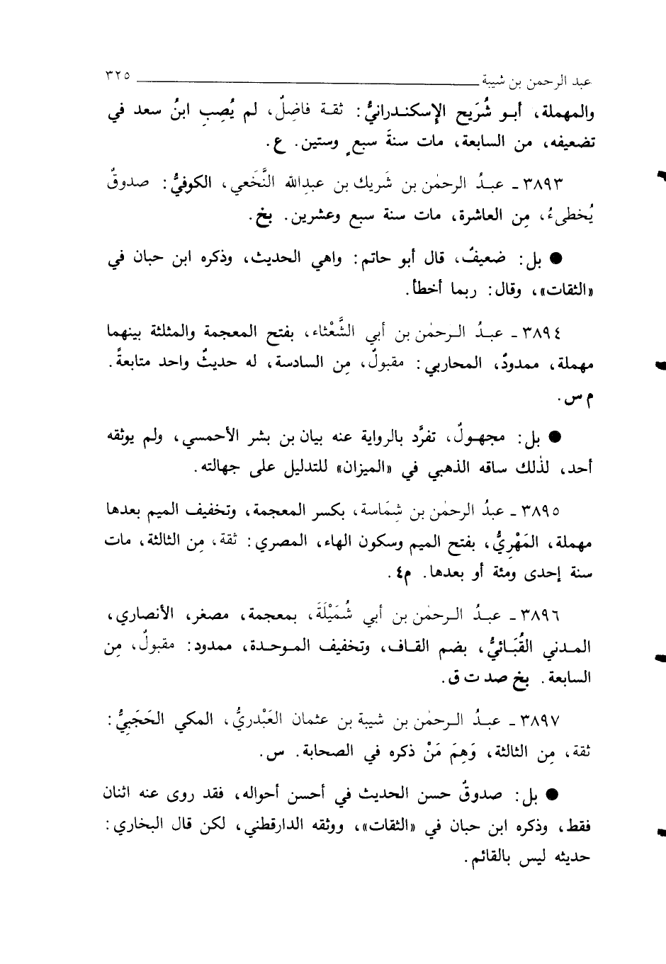 3897 - عبدُ الرحمن بن شيبة بن عثمان العبْدريُّ، المكي الحَجَبِيُّ: ثقة، مِن الثالثة، وَهِمَ مَنْ ذكره في الصحابة. س.