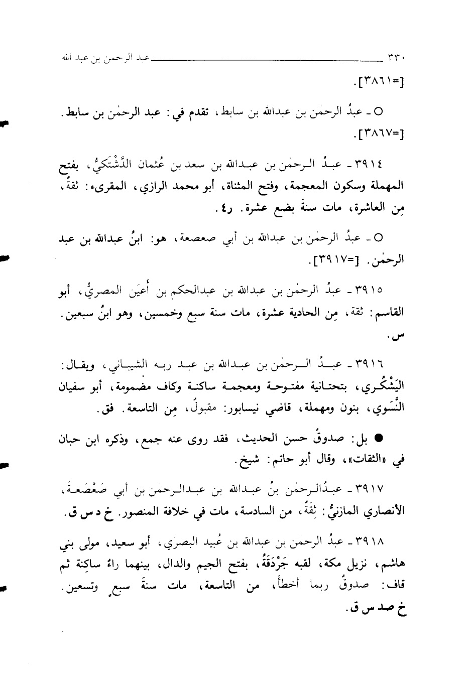 3914 - عبدُ الرحمن بن عبد الله بن سعد بن عُثمان الدَّشْتَكيُّ، بفتح المهملة وسكون المعجمة، وفتح المثناة، أبو محمد الرازي، المقرئ: ثقةٌ، مِن العاشرة، مات سنةَ بضع عشرة. ر 4.