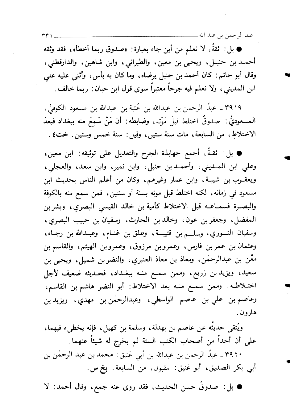 3919 - عبدُ الرحمن بن عبد الله بن عُتبة بن عبد الله بن مسعود الكوفيُّ، المسعوديُّ: صدوق اختلط قبل مَوْته، وضابطه: أن مَنْ سَمِعَ منه ببغداد فبعدَ الاختلاطِ، من السابعة، مات سنة ستين، وقيل: سنة خمس وستين. خت 4.