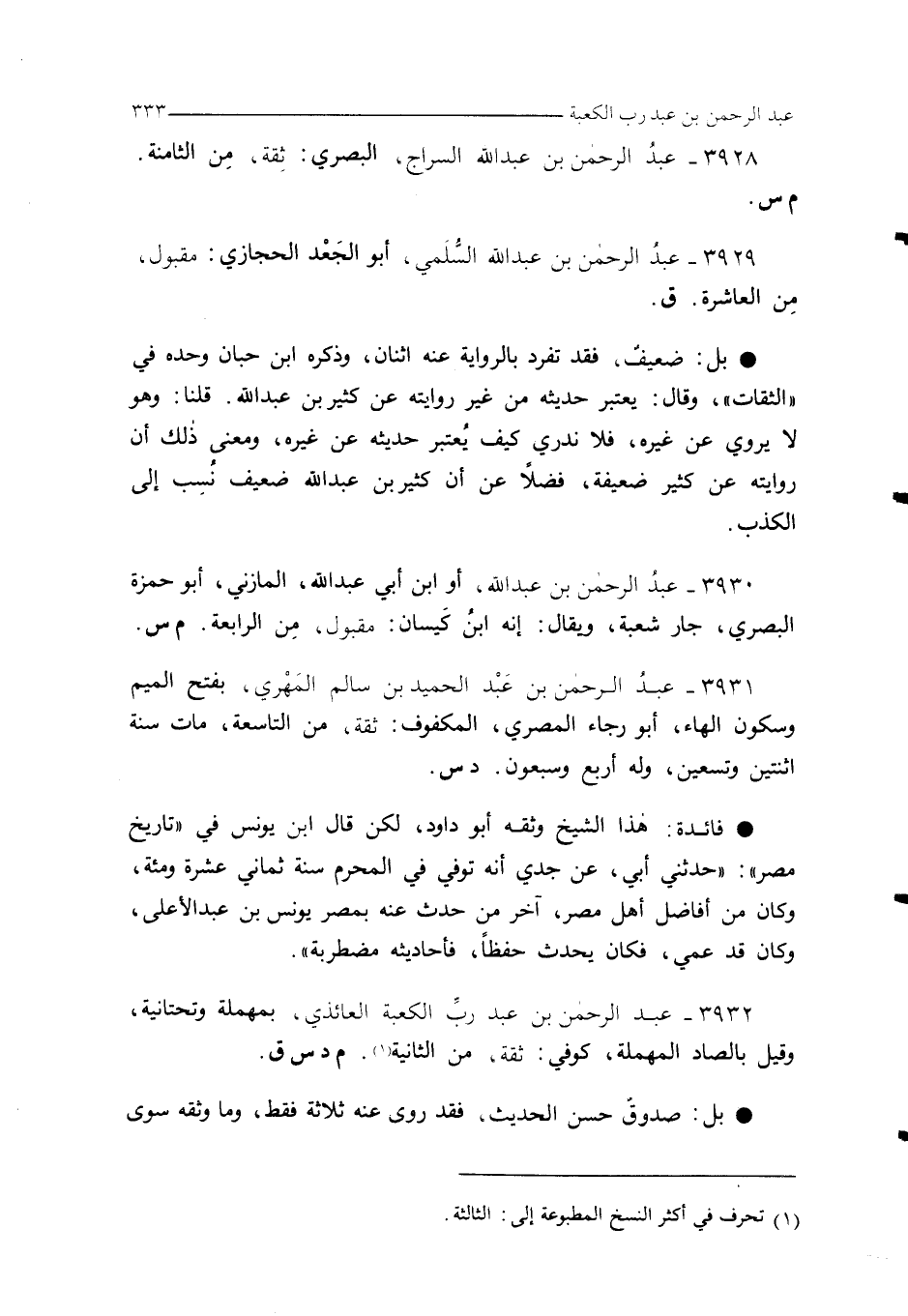 3928 - عبدُ الرحمن بن عبد الله السراج، البصري: ثِقة، مِن الثامنة. م س.