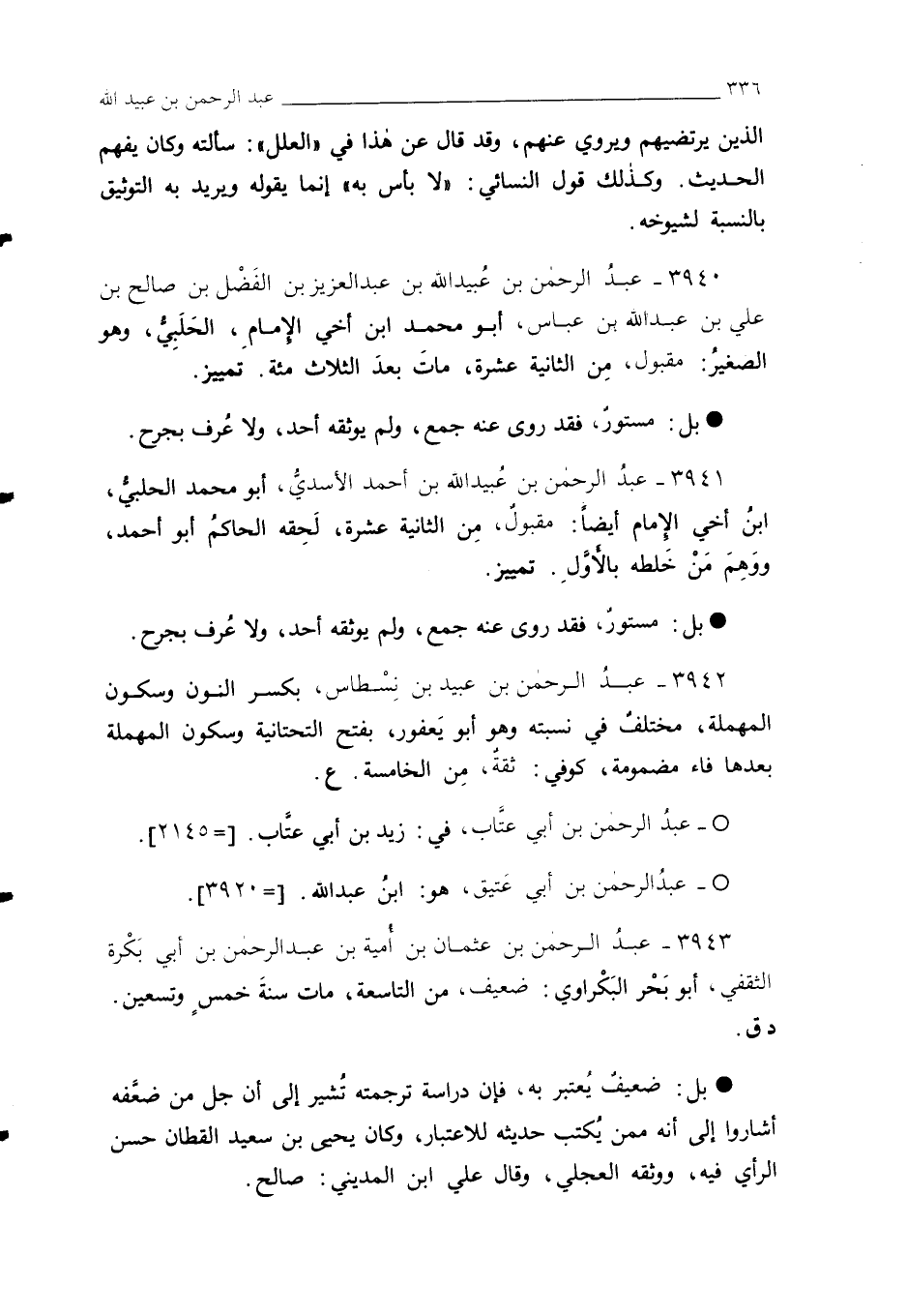 3941 - عبدُ الرحمن بن عُبيد اللَه بن أحمد الأسديُّ، أبو محمد الحلبيُّ، ابنُ أخي الإمام أيضًا: مقبولٌ، مِن الثانية عشرة، لَحِقه الحاكمُ أبو أحمد، ووَهِمَ مَنْ خَلطه بالأوَّلِ. تمييز.