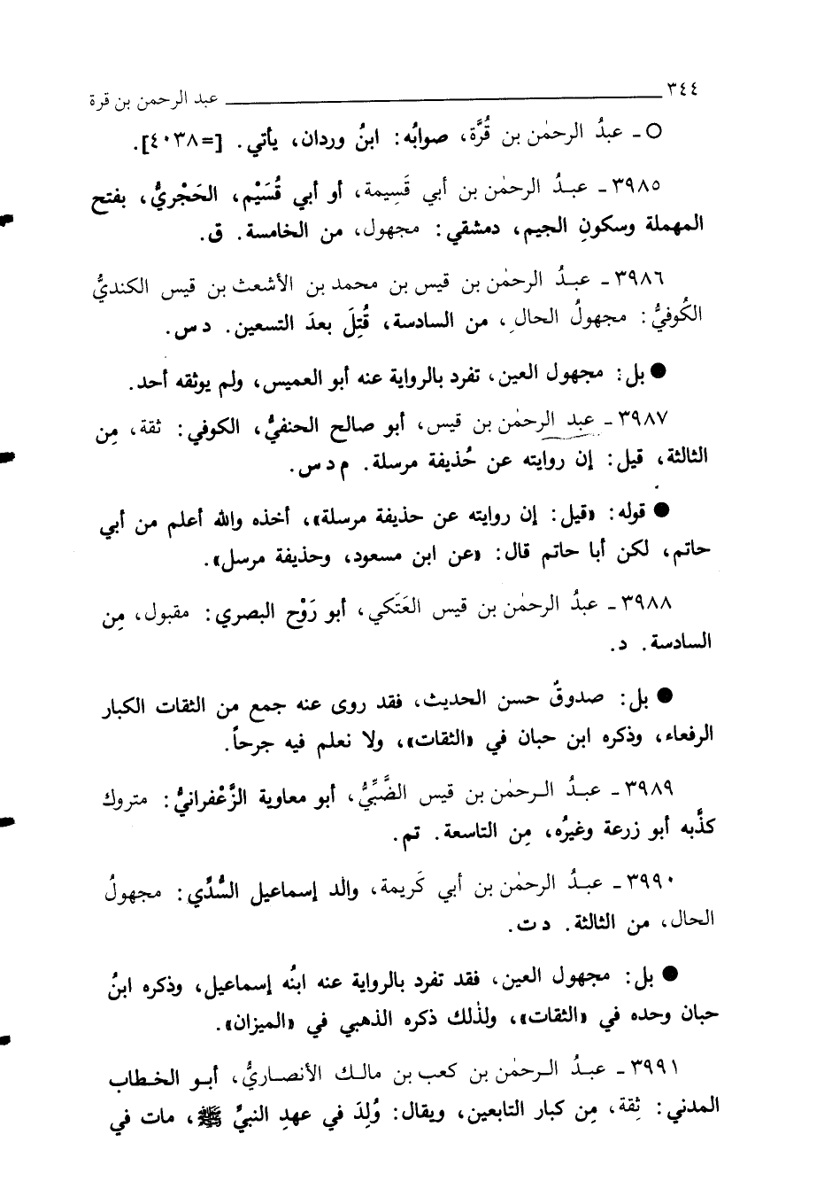 3990 - عبدُ الرحمن بن أبي كَريمة، والد إسماعيل السُّدِّي: مجهولُ الحال، من الثالثة. د ت.