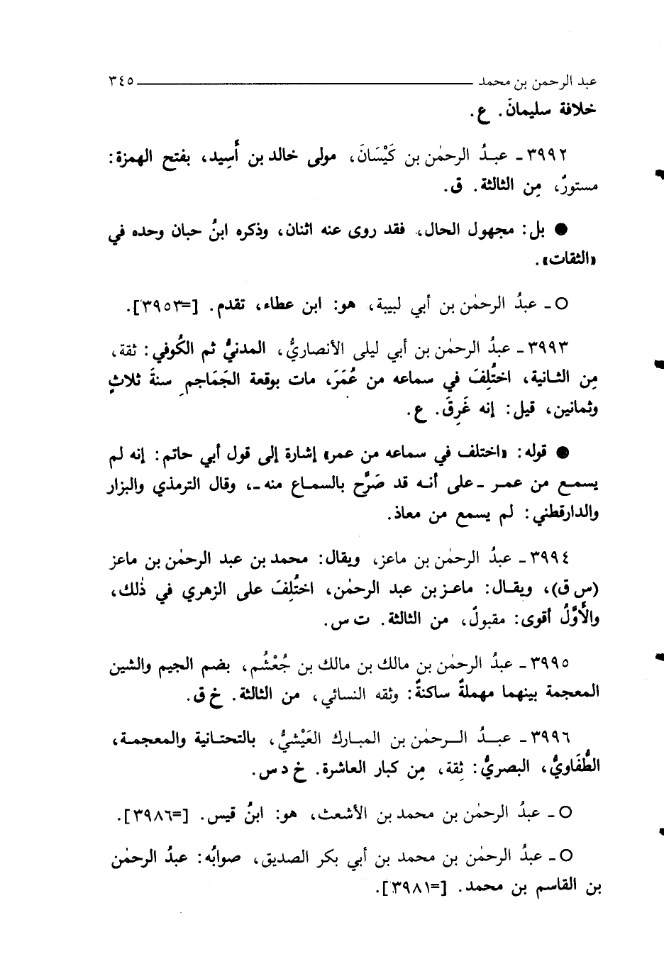 3992 - عبدُ الرحمن بن كَيْسَانَ، مولى خالد بن أَسِيد، بفتح الهمزة: مستورٌ، مِن الثالثة. ق.