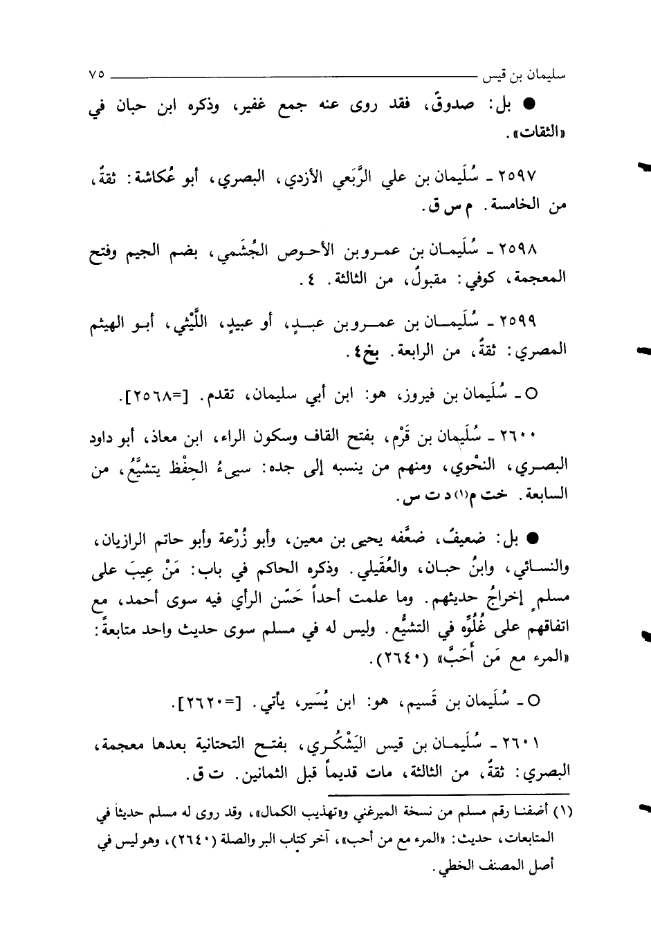 2600 - سُلَيمان بن قَرْم، بفتح القاف وسكون الراء، ابن معاذ، أبو داود البصري، النحْوي، ومنهم من ينسبه إلى جده: سيئُ الحِفْظ يتشيَّعُ، من السابعة. خت م (¬1) د ت س.