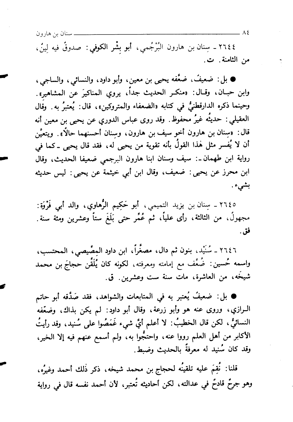 2644 - سِنان بن هارون البُرْجُمي، أبو بِشْر الكوفي: صدوقٌ فيه لِينٌ، من الثامنة. ت.