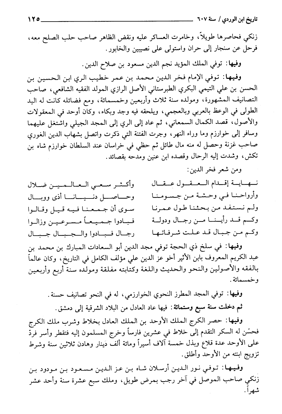 وفيهَا: توفّي الإِمَام فَخر الدّين مُحَمَّد بن عمر خطيب الرّيّ ابْن الْحُسَيْن بن الْحسن بن عَليّ التَّيْمِيّ الْبكْرِيّ الطبرستاني الأَصْل الرَّازِيّ المولد الْفَقِيه الشَّافِعِي، صَاحب التصانيف الْمَشْهُورَة، ومولده سنة ثَلَاث وَأَرْبَعين وَخَمْسمِائة، وَمَعَ فضائله كَانَت لَهُ الْيَد الطُّولى فِي الْوَعْظ بالعربي وبالعجمي، ويلحقه فِيهِ وجد وبكاء، وَكَانَ أوحد فِي المعقولات وَالْأُصُول، قصد الْكَمَال السَّمْعَانِيّ، ثمَّ عَاد إِلَى الرّيّ إِلَى الْمجد الجيلي واشتغل عَلَيْهِمَا وسافر إِلَى خوارزم وَمَا وَرَاء النَّهر، وَجَرت الْفِتْنَة الَّتِي ذكرت واتصل بشهاب الدّين الغوري صَاحب غزنة وَحصل لَهُ مِنْهُ مَال طائل ثمَّ حظي فِي خُرَاسَان عِنْد السُّلْطَان خوارزم شاه بن تكش، وشدت إِلَيْهِ الرّحال وقصده ابْن عنين ومدحه بقصائد.