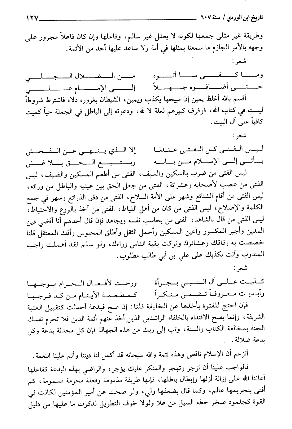 لَيْسَ الْفَتى من ضرب بالسكين وَالسيف، الْفَتى من أطْعم الْمِسْكِين والضيف، لَيْسَ الْفَتى من عصب لأَصْحَابه وعشرائه، الْفَتى من جعل الْحق بَين عَيْنَيْهِ وَالْبَاطِل من وَرَائه، لَيْسَ الْفَتى من أَقَامَ الشنائع وَشهر على الْأمة السِّلَاح، الْفَتى من دقق الذرائع وسهر فِي جمع الْكَلِمَة والإصلاح، لَيْسَ الْفَتى من كَانَ من أهل اللياط، الْفَتى من أَخذ بالورع وَالِاحْتِيَاط، لَيْسَ الْفَتى من قَالَ بِالشَّاهِدِ، الْفَتى من يُحَاسب نَفسه ويجاهد فَإِن قَالَ أحدهم أَنا أَقْْضِي دين الْمَدِين وأجبر المكسور وأعين الْمِسْكِين وأحمل الثّقل وَأطلق الْمَحْبُوس وأفك المعتقل قُلْنَا خصصت بِهِ رفاقك وعشائرك وَتركت بَقِيَّة النَّاس وَرَاءَك، وَلَو سلم فقد أهملت وَاجِب الْمَنْدُوب وَأَنت بكذبك على عَليّ بن أبي طَالب مَطْلُوب.