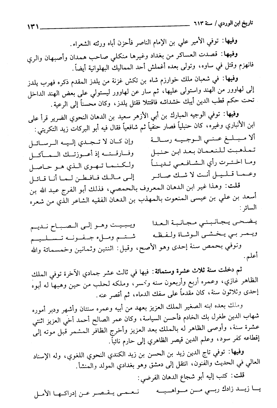 ثمَّ دخلت سنة ثَلَاث عشرَة وسِتمِائَة: فِيهَا فِي ثَالِث عشر جمادي الْآخِرَة توفّي الْملك الظَّاهِر غَازِي، وعمره أَربع وَأَرْبَعُونَ سنة وَكسر، وَملكه لحلب من حِين وَهبهَا لَهُ أَبوهُ إِحْدَى وَثَلَاثُونَ سنة، كَانَ مقدما على سفك الدِّمَاء، ثمَّ أقصر عَنهُ.