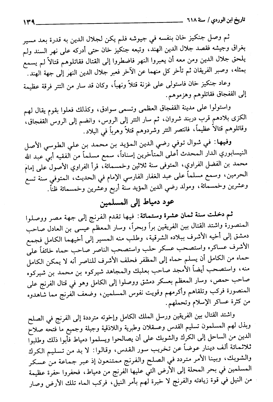 ثمَّ دخلت سنة ثَمَان عشرَة وسِتمِائَة: فِيهَا تقدم الفرنج إِلَى جِهَة مصر ووصلوا المنصورة وَاشْتَدَّ الْقِتَال بَين الْفَرِيقَيْنِ برا وبحراً، وَسَار الْمُعظم عِيسَى بن الْعَادِل صَاحب دمشق إِلَى أَخِيه الْأَشْرَف ببلاده الشرقية، وَطلب مِنْهُ الْمسير إِلَى أخيهما الْكَامِل فَجمع الْأَشْرَف عساكره واستصحب عَسْكَر حلب واستصحب النَّاصِر صَاحب حماه خَائفًا على حماه الْكَامِل أَن يسلم حماه إِلَى المظفر فَحلف الْأَشْرَف للناصر أَنه لَا يُمكن الْكَامِل مِنْهُ، واستصحب أَيْضا الأمجد صَاحب بعلبك والمجاهد شيركوه بن مُحَمَّد بن شيركوه صَاحب حمص، وَسَار الْمُعظم بعسكر دمشق ووصلوا إِلَى الْكَامِل وَهُوَ فِي قتال الفرنج على المنصورة فَركب وتلقاهم وَأكْرمهمْ وقويت نفوس الْمُسلمين، وَضعف الفرنج مِمَّا شاهدوه من كَثْرَة عَسَاكِر الْإِسْلَام وتحملهم.
