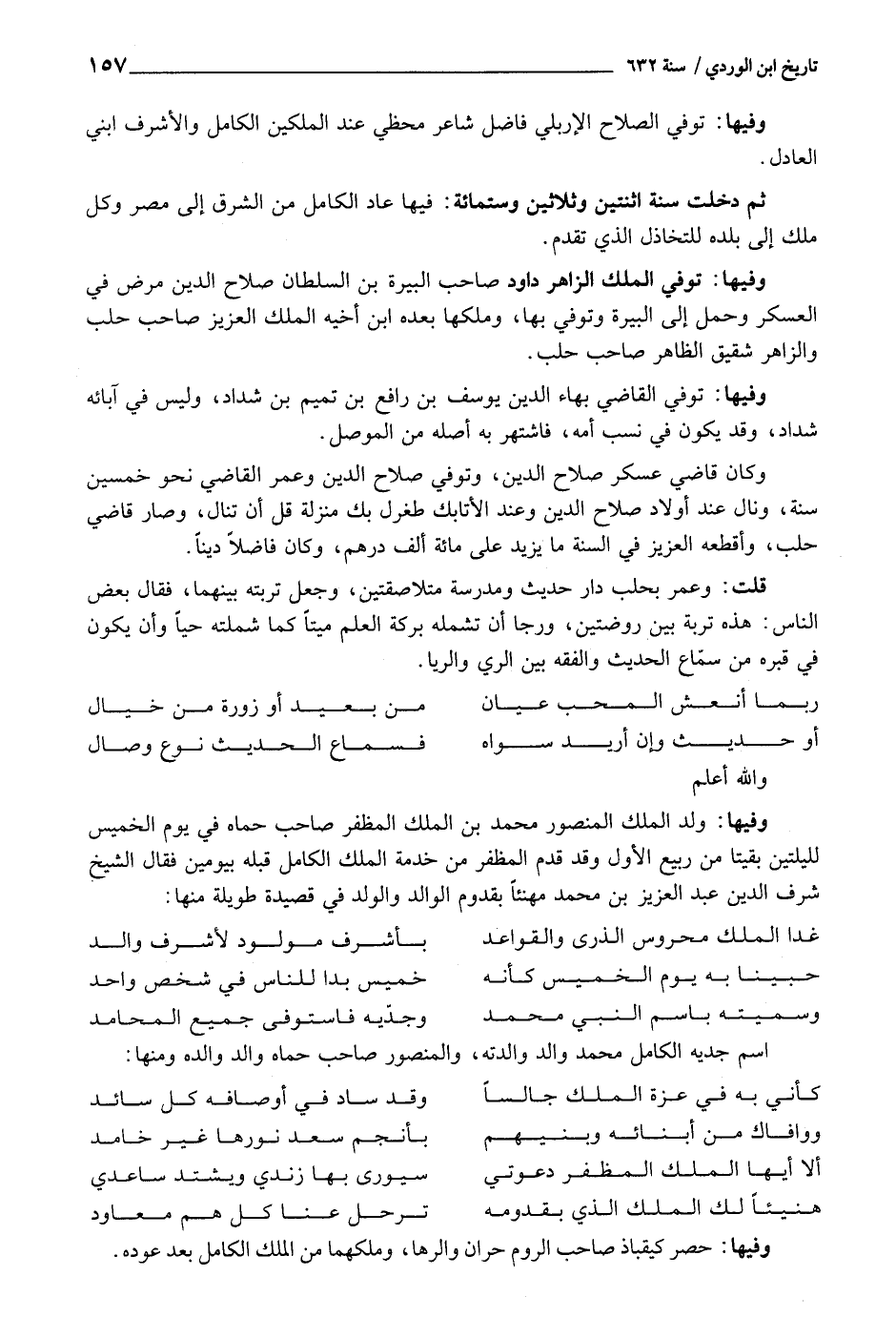 وفيهَا: ولد الْملك الْمَنْصُور مُحَمَّد بن الْملك المظفر صَاحب حماه فِي يَوْم الْخَمِيس لليلتين بَقِيَتَا من ربيع الأول وَقد قدم المظفر من خدمَة الْملك الْكَامِل قبله بيومين فَقَالَ الشَّيْخ شرف الدّين عبد الْعَزِيز بن مُحَمَّد مهنئاً بقدوم الْوَالِد وَالْولد فِي قصيدة طَوِيلَة مِنْهَا: