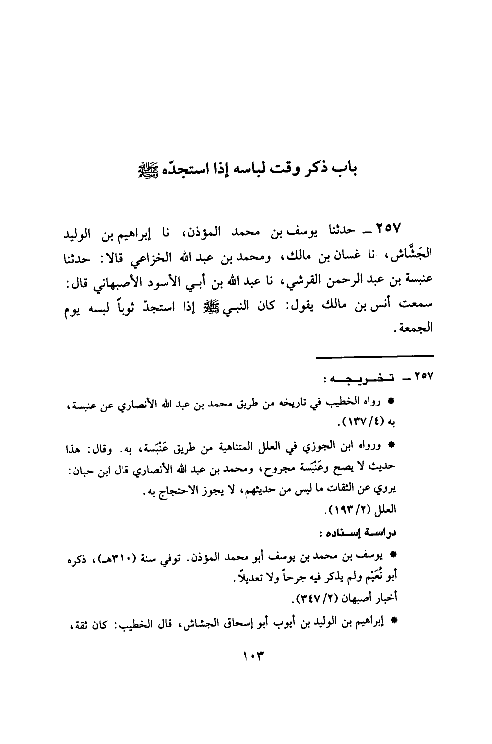 257 - حَدَّثَنَا يُوسُفُ بْنُ مُحَمَّدٍ الْمُؤَذِّنُ، نَا إِبْرَاهِيمُ بْنُ الْوَلِيدِ الْحَشَّاشُ، نَا غَسَّانُ بْنُ مَالِكٍ، وَمُحَمَّدُ بْنُ عَبْدِ اللَّهِ الْخُزَاعِيُّ، قَالَا: حَدَّثَنَا عَنْبَسَةُ بْنُ عَبْدِ الرَّحْمَنِ الْقُرَشِيُّ، نَا عَبْدُ اللَّهِ بْنُ أَبِي الْأَسْوَدِ الْأَصْفَهَانِيُّ، قَالَ: سَمِعْتُ أَنَسَ بْنَ مَالِكٍ، يَقُولُ: كَانَ النَّبِيُّ صَلَّى اللهُ عَلَيْهِ وَسَلَّمَ §إِذَا اسْتَجَدَّ ثَوْبًا لَبِسَهُ يَوْمَ الْجُمُعَةِ