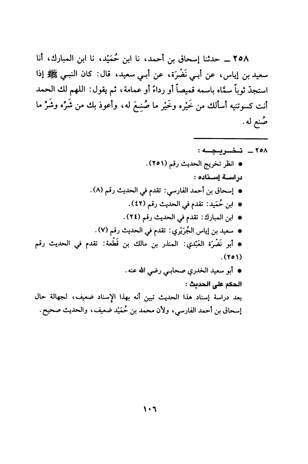 258 - حَدَّثَنَا إِسْحَاقُ بْنُ أَحْمَدَ، نَا ابْنُ حُمَيْدٍ، نَا ابْنُ الْمُبَارَكِ، أنا سَعِيدُ بْنُ إِيَاسَ، عَنْ أَبِي نَضْرَةَ، عَنْ أَبِي سَعِيدٍ، قَالَ: كَانَ النَّبِيُّ صَلَّى اللهُ عَلَيْهِ وَسَلَّمَ إِذَا اسْتَجَدَّ ثَوْبًا سَمَّاهُ بِاسْمِهِ قَمِيصًا، أَوْ رِدَاءً، أَوْعِمَامَةً، ثُمَّ يَقُولُ: §اللَّهُمَّ لَكَ الْحَمْدُ أَنْتَ كَسَوْتَنِيهِ، أَسْأَلُكَ مِنْ خَيرِهِ، وَخَيْرِ مَا صُنِعَ لَهُ، وَأَعُوذُ بِكَ مِنْ شَرِّهِ، وَشَرِّ مَا صُنِعَ لَهُ