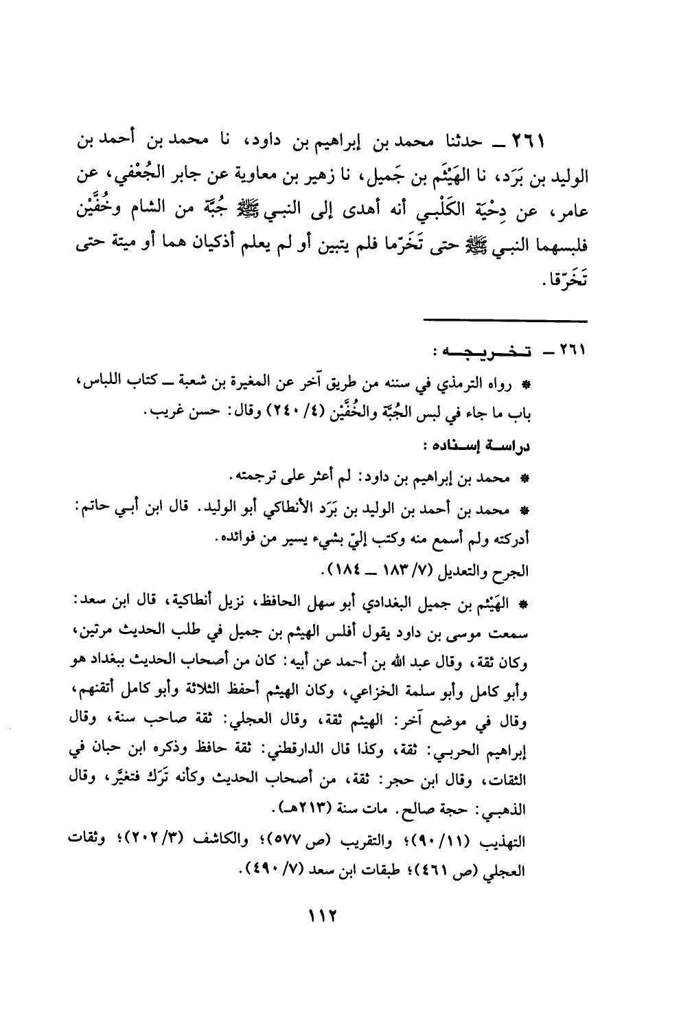 261 - حَدَّثَنَا مُحَمَّدُ بْنُ إِبْرَاهِيمَ بْنِ دَاوَدَ، نَا مُحَمَّدُ بْنُ أَحْمَدَ بْنِ الْوَلِيدِ بْنِ بُرْدٍ، نَا الْهَيْثَمُ بْنُ جَمِيلٍ، نَا زُهَيْرُ بْنُ مُعَاوِيَةَ، عَنْ جَابِرٍ الْجُعْفِيِّ، عَنْ عَامِرٍ، عَنْ دِحْيَةَ الْكَلْبِيِّ، أَنَّهُ §أُهْدِيَ إِلَى النَّبِيِّ صَلَّى اللهُ عَلَيْهِ وَسَلَّمَ جُبَّةٌ مِنَ الشَّامِ وَخُفَّيْنِ، فَلَبِسَهُمَا النَّبِيُّ صَلَّى اللهُ عَلَيْهِ وَسَلَّمَ حَتَّى تَخَرَّقَا، فَلَمْ يَتَبَيَّنْ، أَوْ لَمْ يَعْلَمْ أَذَكِيَّانِ هُمَا أَوْ مَيْتَةٌ؟ حَتَّى تَخَرَّقَا