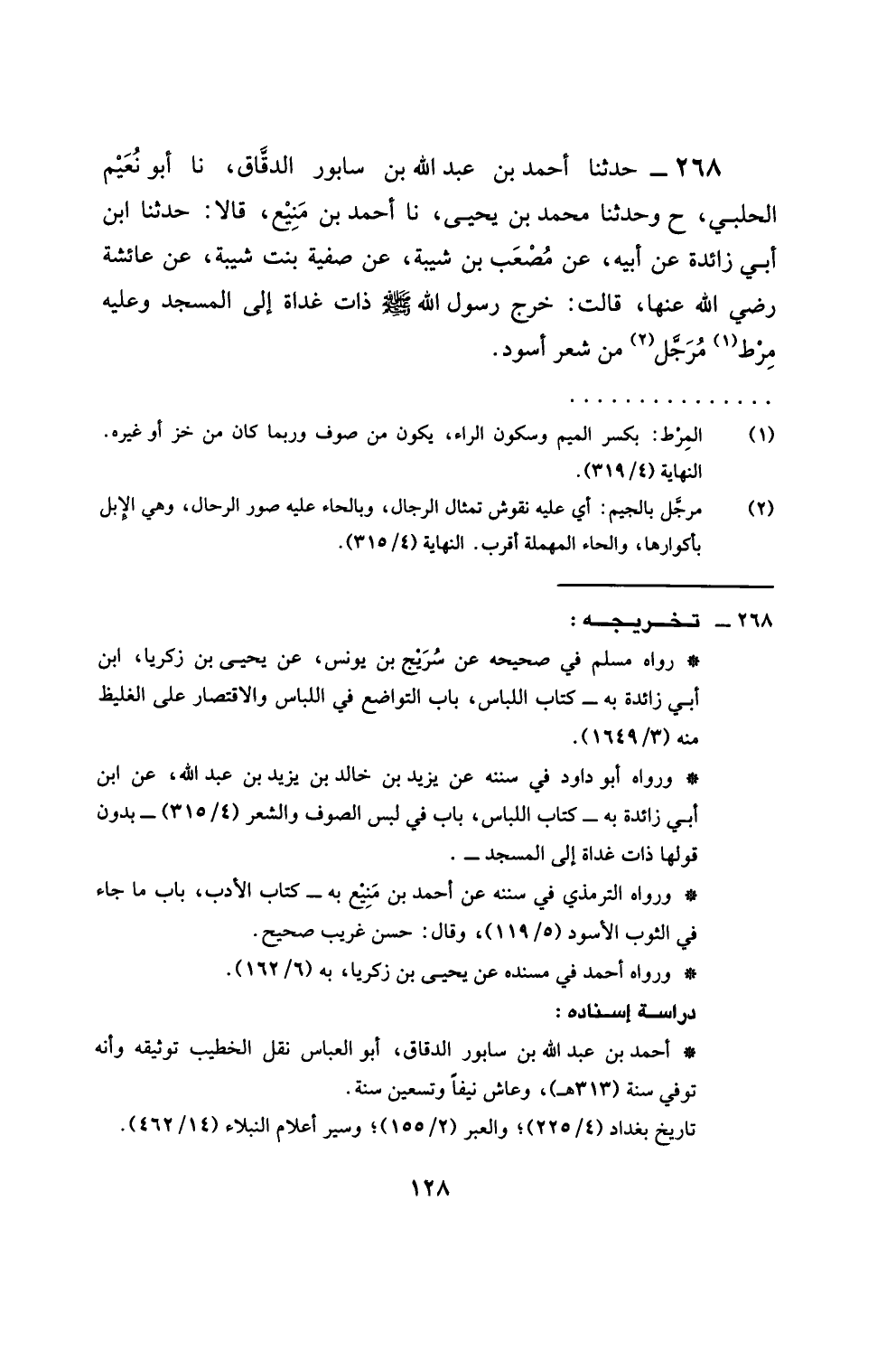 268 - حَدَّثَنَا أَحْمَدُ بْنُ عَبْدِ اللَّهِ بْنِ سَابُورٍ الدَّقَّاقُ، نَا أَبُو نُعَيْمٍ الْحَلَبِيُّ. ح. وَحَدَّثَنَا مُحَمَّدُ بْنُ يَحْيَى، نَا أَحْمَدُ بْنُ مَنِيعٍ، قَالَا: حَدَّثَنَا ابْنُ أَبِي زَائِدَةَ، عَنْ أَبِيهِ، عَنْ مُصْعَبِ بْنِ شَيْبَةَ، عَنْ صَفِيَّةَ بِنْتِ شَيْبَةَ، عَنْ عَائِشَةَ، رَضِيَ اللَّهُ عَنْهَا، قَالَتْ: §خَرَجَ رَسُولُ اللَّهِ صَلَّى اللهُ عَلَيْهِ وَسَلَّمَ ذَاتَ غَدَاةٍ إِلَى الْمَسْجِدِ وَعَلَيْهِ مِرْطٌ مُرَحَّلٌ مِنْ شَعَرٍ أَسْوَدَ