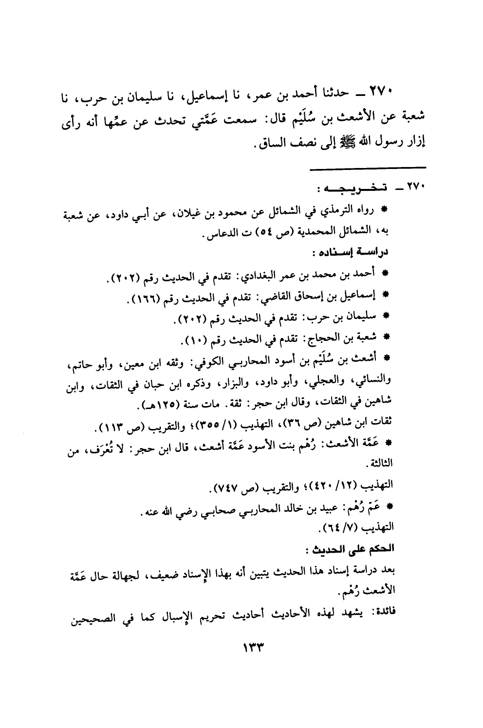 270 - حَدَّثَنَا أَحْمَدُ بْنُ عُمَرَ، نَا إِسْمَاعِيلُ، نَا سُلَيْمَانُ بْنُ حَرْبٍ، نَا شُعْبَةُ، عَنِ الْأَشْعَثِ بْنِ سُلَيْمٍ، قَالَ: سَمِعْتُ عَمَّتِيَ، تُحَدِّثُ عَنْ عَمِّهَا، أَنَّهُ §رَأَى إِزَارَ رَسُولِ اللَّهِ صَلَّى اللهُ عَلَيْهِ وَسَلَّمَ أَسْفَلَ إِلَى نِصْفِ السَّاقِ