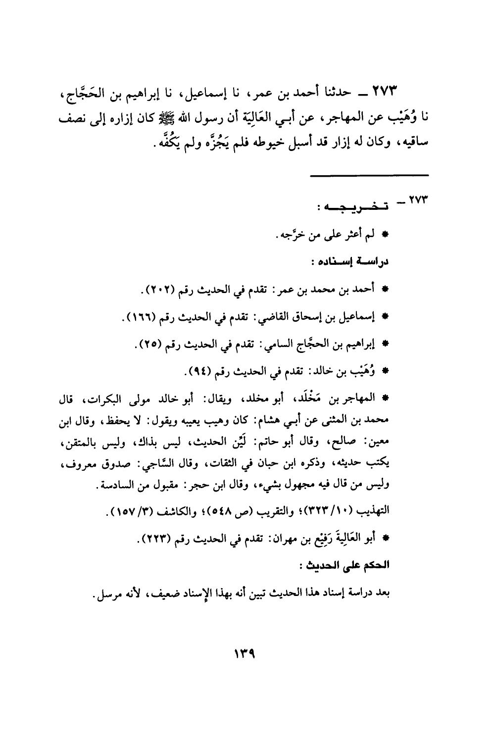 273 - حَدَّثَنَا أَحْمَدُ بْنُ عُمَرَ، نَا إِسْمَاعِيلُ، نَا إِبْرَاهِيمُ بْنُ الْحَجَّاجِ، نَا وُهَيْبٌ، عَنِ الْمُهَاجِرِ، عَنْ أَبِي الْعَالِيَةِ، §أَنَّ رَسُولُ اللَّهِ صَلَّى اللهُ عَلَيْهِ وَسَلَّمَ كَانَ إِزَارُهُ إِلَى نِصْفِ سَاقَيْهِ، وَكَانَ لَهُ إِزَارٌ قَدْ أَسْبَلَ خُيُوطَهُ فَلَمْ يَجُزَّهُ، وَلَمْ يَكْفِهِ