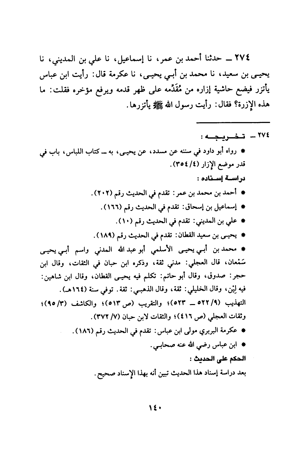 274 - حَدَّثَنَا أَحْمَدُ بْنُ عُمَرَ، نَا إِسْمَاعِيلُ، نَا عَلِيُّ بْنُ الْمَدِينِيِّ، نَا يَحْيَى بْنُ سَعِيدٍ، نَا مُحَمَّدُ بْنُ أَبِي يَحْيَى، نَا عِكْرِمَةُ، قَالَ: §رَأَيْتُ ابْنَ عَبَّاسٍ يَأْتَزِرُ فَيَضَعُ حَاشِيَةَ إِزَارِهِ مِنْ مُقَدَّمِهِ عَلَى ظَهْرِ قَدَمِهِ، وَيَرْفَعُ مُؤَخَّرَهُ، فَقُلْتُ: مَا هَذِهِ الْإِزْرَةُ؟ فَقَالَ: رَأَيْتُ رَسُولَ اللَّهِ صَلَّى اللهُ عَلَيْهِ وَسَلَّمَ يَأْتَزِرُهَا
