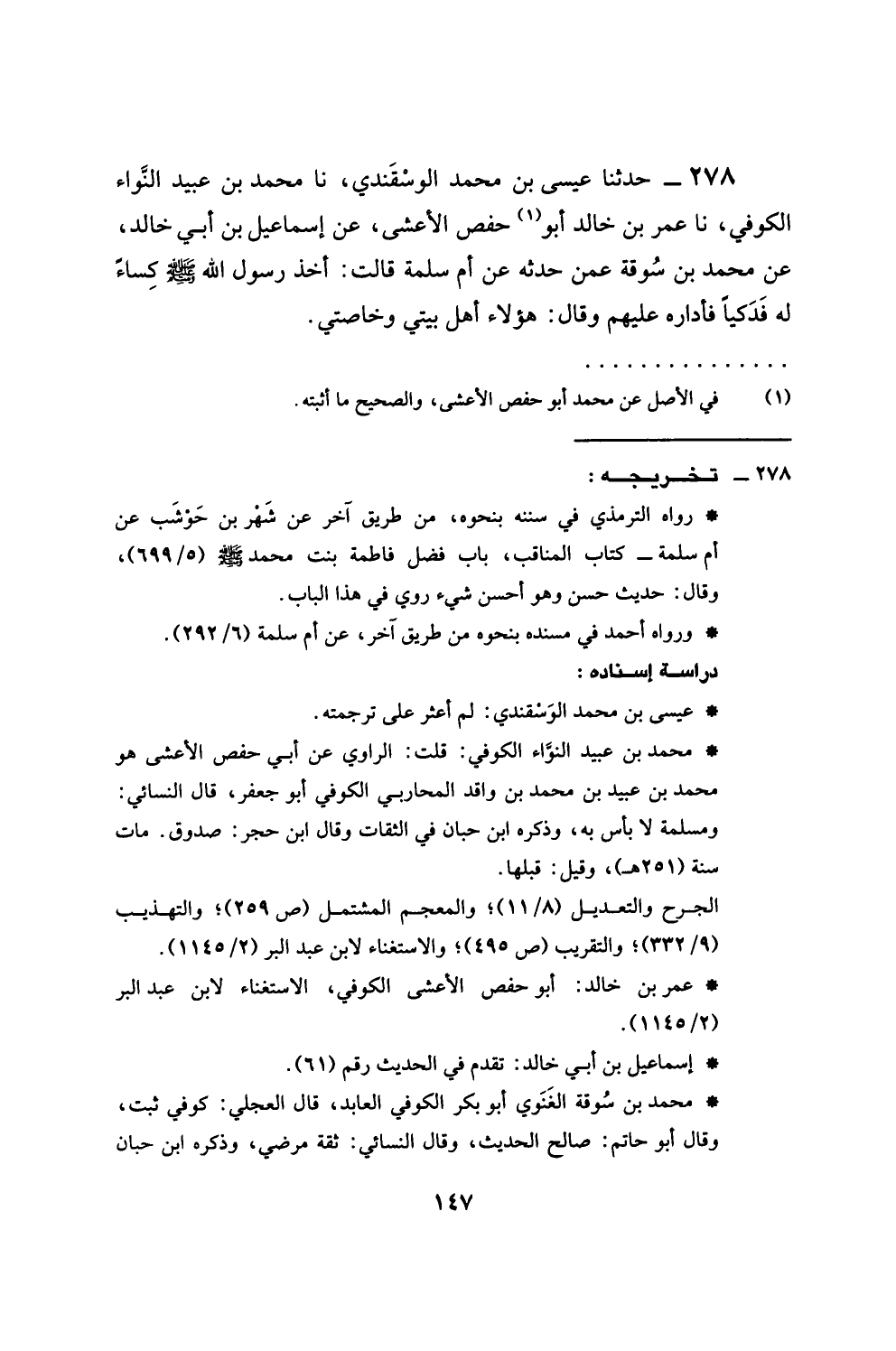 278 - حَدَّثَنَا عِيسَى بْنُ مُحَمَّدٍ الْوَسْقَنْدِيُّ، نَا مُحَمَّدُ بْنُ عُبَيْدٍ النَّوَا الْكُوفِيُّ، نَا عُمَرُ بْنُ خَالِدٍ أَبُو حَفْصٍ الْأَعْشَى، عَنْ إِسْمَاعِيلَ بْنِ أَبِي خَالِدٍ، عَنْ مُحَمَّدِ بْنِ سُوقَةَ، عَمَّنْ حَدَّثَهُ عَنْ أُمِّ سَلَمَةَ، قَالَتْ: §أَخَذَ رَسُولُ اللَّهِ صَلَّى اللهُ عَلَيْهِ وَسَلَّمَ كِسَاءً لَهُ فَدَكِيًّا، فَأَدَارَهُ عَلَيْهِمْ، ثُمَّ قَالَ: هَؤُلَاءِ أَهْلُ بَيْتِي وَحَامَّتِي