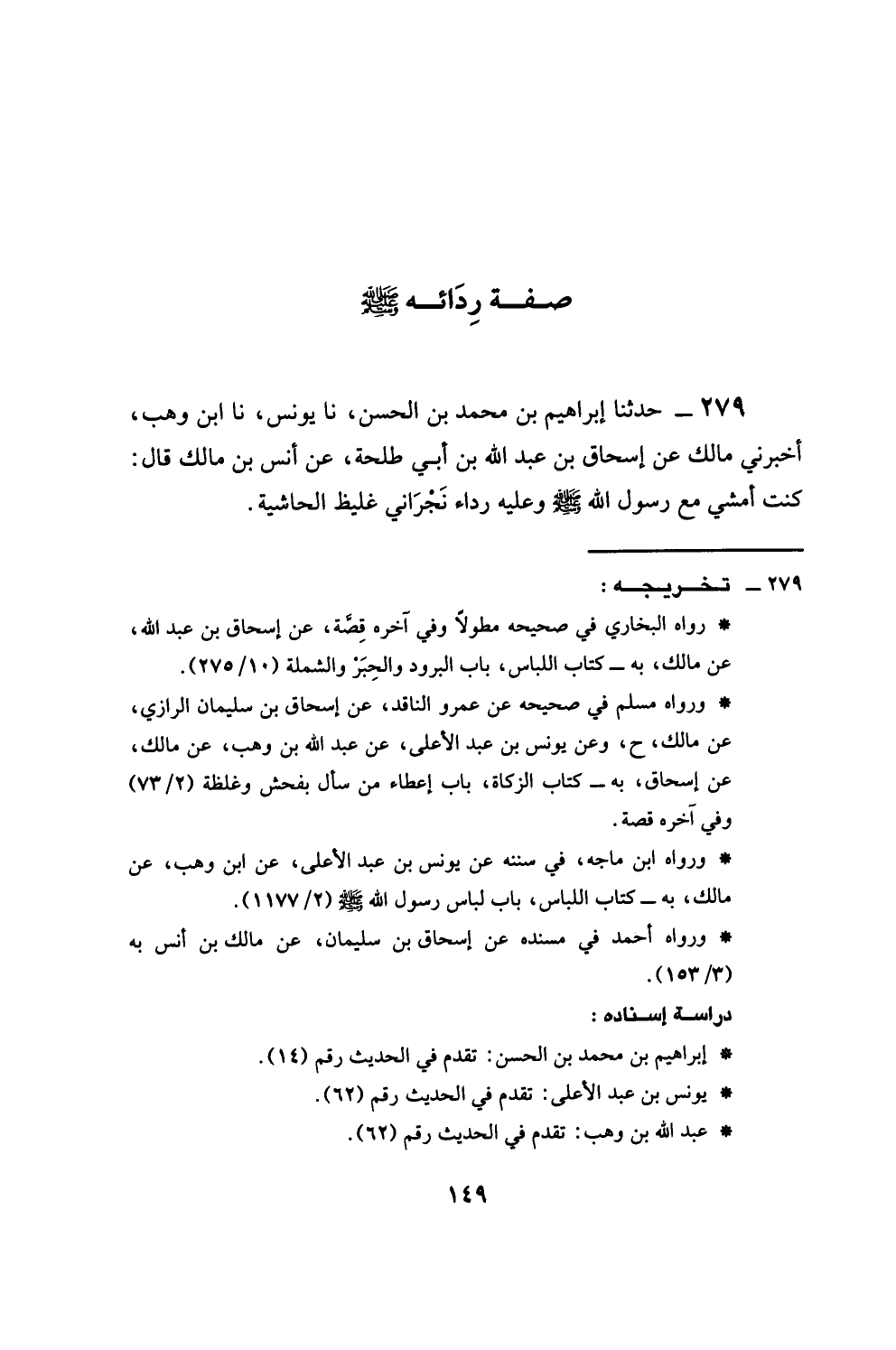 279 - حَدَّثَنَا إِبْرَاهِيمُ بْنُ مُحَمَّدِ بْنِ الْحَسَنِ، نَا يُونُسُ، نَا ابْنُ وَهْبٍ، أَخْبَرَنِي مَالِكٌ، عَنْ إِسْحَاقَ بْنِ عَبْدِ اللَّهِ بْنِ أَبِي طَلْحَةَ، عَنْ أَنَسِ بْنِ مَالِكٍ، قَالَ: §كُنْتُ أَمْشِي مَعَ رَسُولُ اللَّهِ صَلَّى اللهُ عَلَيْهِ وَسَلَّمَ، وَعَلَيْهِ رِدَاءٌ نَجْرَانِيُّ غَلِيظُ الْحَاشِيَةِ