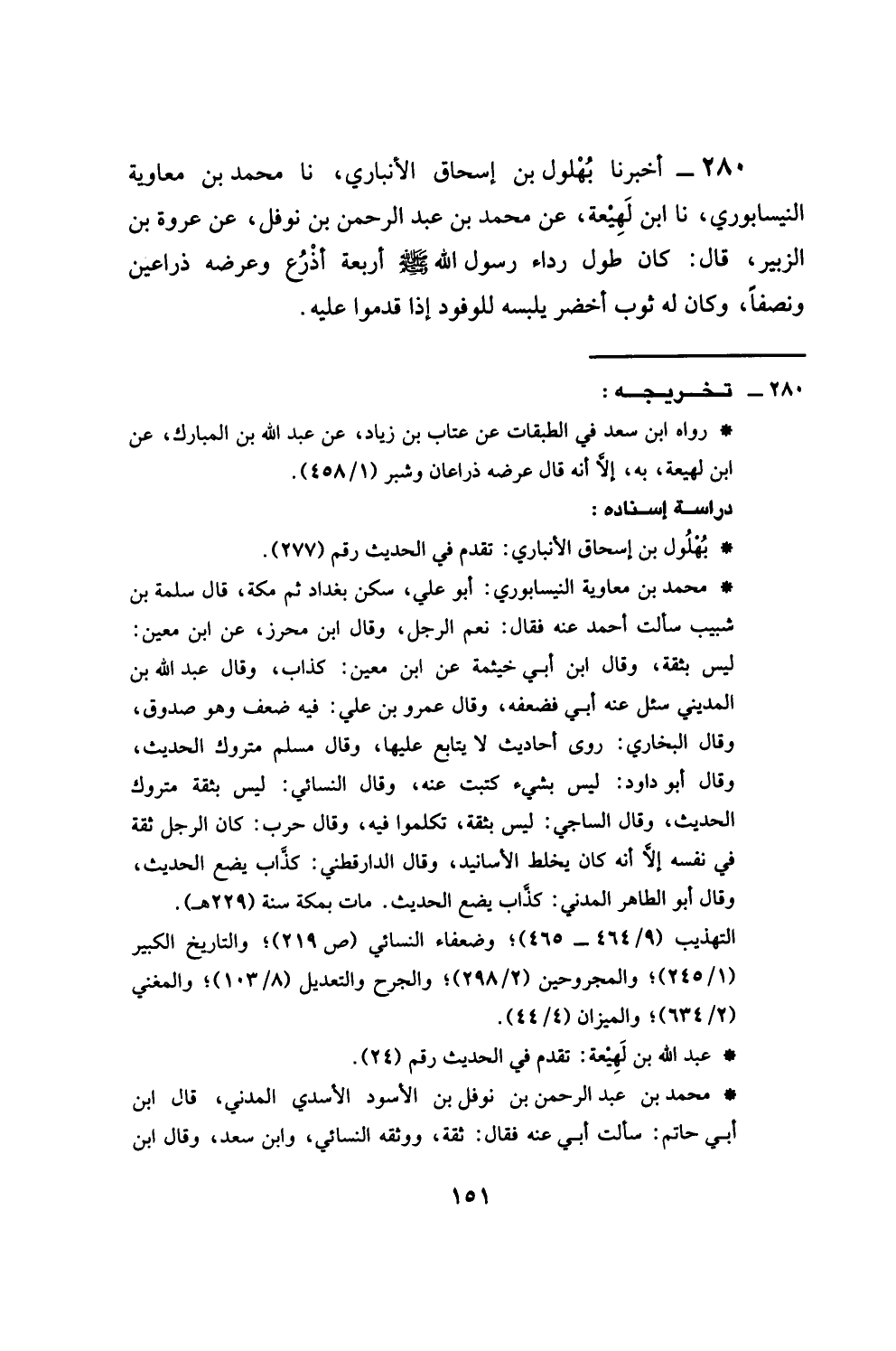 أَخْبَرَنَا بُهْلُولُ بْنُ إِسْحَاقَ الْإِنْبَارِيُّ، نَا مُحَمَّدُ بْنُ مُعَاوِيَةَ النَّيْسَابُورِيُّ، نَا ابْنُ لَهِيعَةَ، عَنْ مُحَمَّدِ بْنِ عَبْدِ الرَّحْمَنِ بْنِ نَوْفَلٍ، عَنْ عُرْوَةَ بْنِ الزُّبَيْرِ، قَالَ: كَانَ §طُولُ رِدَاءِ رَسُولُ اللَّهِ صَلَّى اللهُ عَلَيْهِ وَسَلَّمَ أَرْبَعَةَ أَذْرُعٍ، وَعَرْضُهُ ذِرَاعَيْنِ وَنِصْفًا، وَكَانَ لَهُ ثَوْبٌ أَخْضَرُ، يَلْبَسُهُ لِلْوفُودِ إِذَا قَدِمُوا عَلَيْهِ