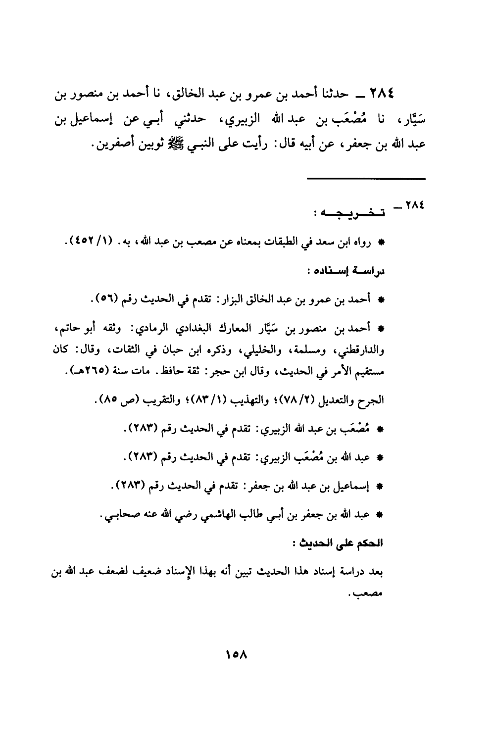 284 - حَدَّثَنَا أَحْمَدُ بْنُ عَمْرِو بْنِ عَبْدِ الْخَالِقِ، نَا أَحْمَدُ بْنُ مَنْصُورِ بْنِ سَيَّارٍ، نَا مُصْعَبُ بْنُ عَبْدِ اللَّهِ الزُّبَيْرِيُّ، حَدَّثَنِي أَبِي، عَنْ إِسْمَاعِيلَ بْنِ عَبْدِ اللَّهِ بْنِ جَعْفَرٍ، عَنْ أَبِيهِ، قَالَ: §رَأَيْتُ عَلَى النَّبِيِّ صَلَّى اللهُ عَلَيْهِ وَسَلَّمَ ثَوْبَيْنِ أَصْفَرَيْنِ
