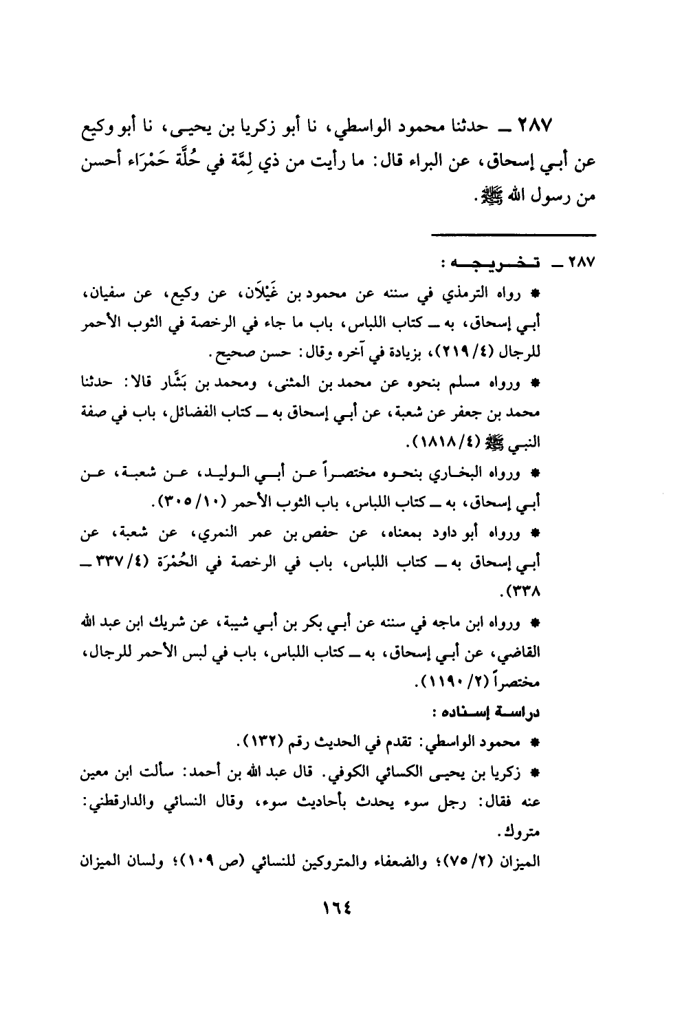287 - حَدَّثَنَا مَحْمُودٌ الْوَاسِطِيُّ، نَا زَكَرِيَّا بْنُ يَحْيَى، نَا أَبُو وَكِيعٍ، عَنْ أَبِي إِسْحَاقَ، عَنِ الْبَرَاءِ، قَالَ: §مَا رَأَيْتُ مِنْ ذِي لِمَّةٍ فِي حُلَّةٍ حَمْرَاءَ أَحْسَنَ مِنْ رَسُولِ اللَّهِ صَلَّى اللهُ عَلَيْهِ وَسَلَّمَ