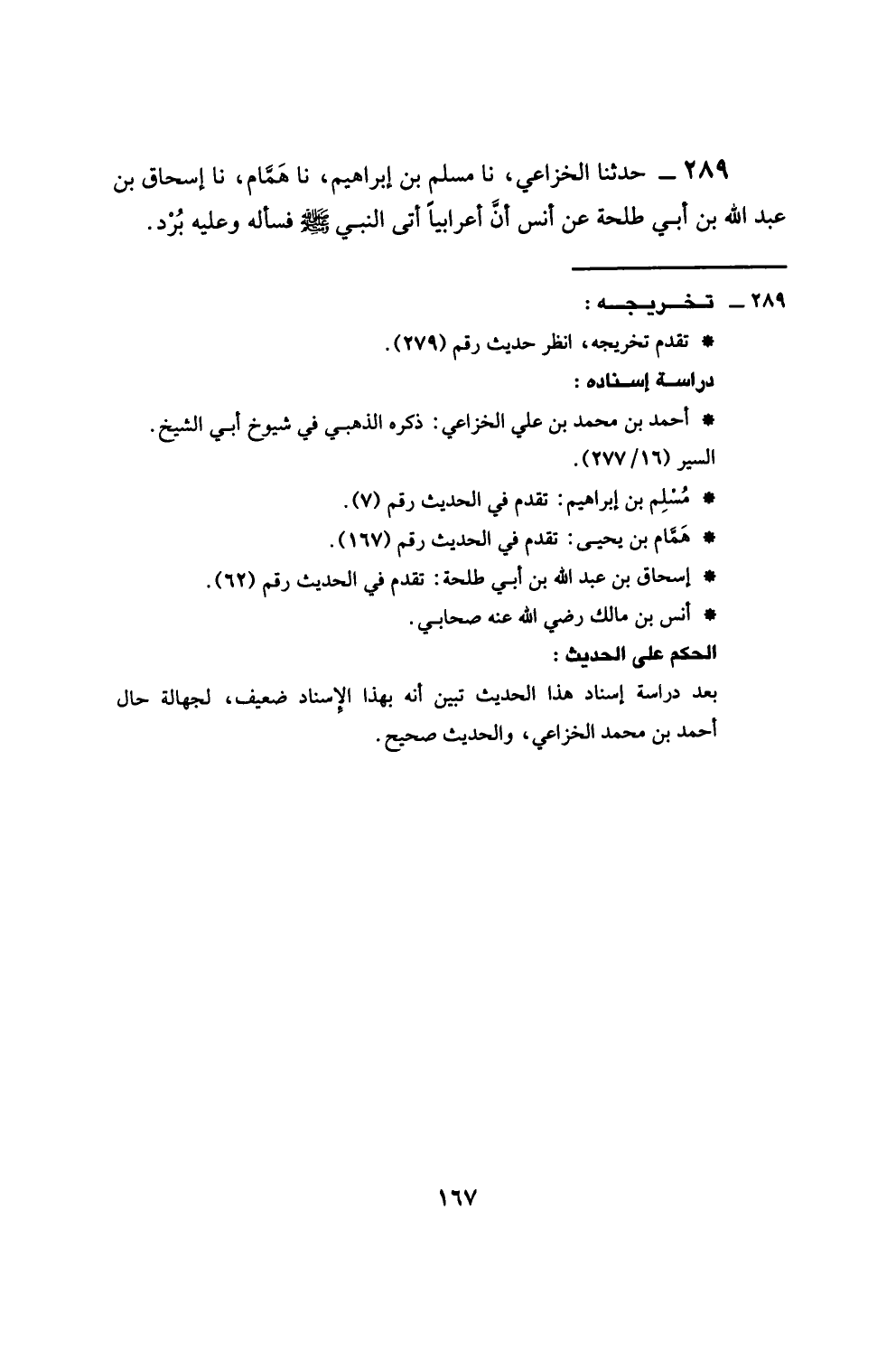 289 - حَدَّثَنَا الْخُزَاعِيُّ، نا مُسْلِمُ بْنُ إِبْرَاهِيمَ، نا هَمَّامٌ، نا إِسْحَاقُ بْنُ عَبْدِ اللَّهِ بْنُ أَبِي طَلْحَةَ، عَنْ أَنَسٍ، §أَنَّ أَعْرَابِيًّا أَتَى النَّبِيَّ صَلَّى اللهُ عَلَيْهِ وَسَلَّمَ فَسَأَلَهُ وَعَلَيْهِ بُرْدٌ