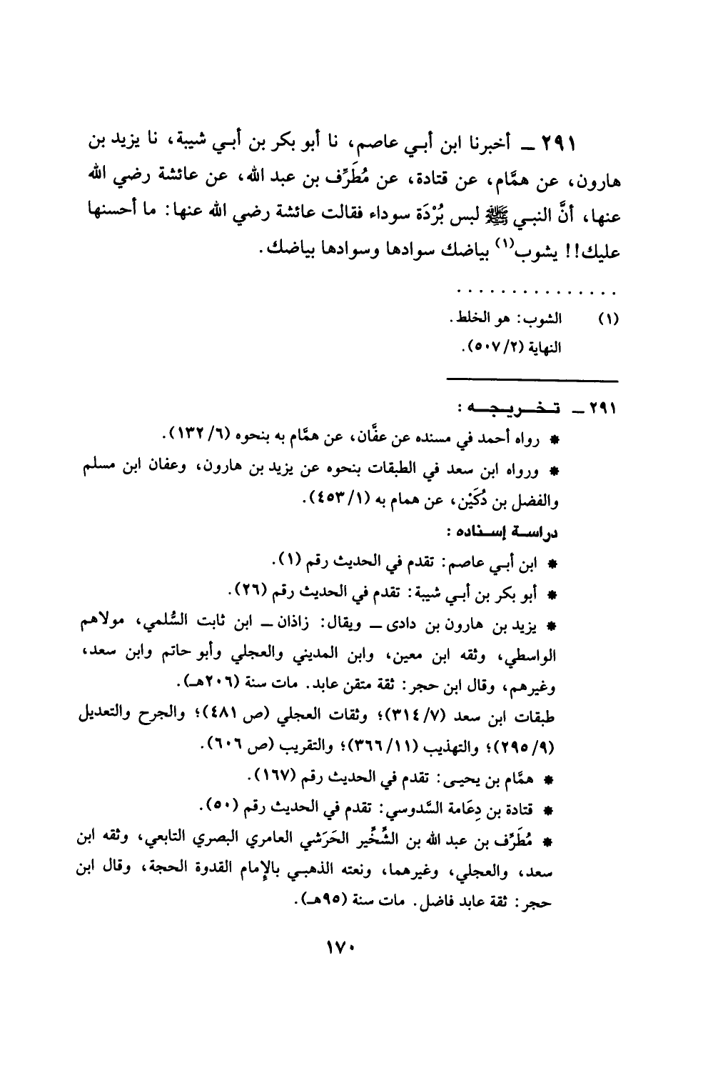 291 - أَخْبَرَنَا ابْنُ أَبِي عَاصِمٍ، نَا أَبُو بَكْرِ بْنُ أَبِي شَيْبَةَ، نا يَزِيدُ بْنُ هَارُونَ، عَنْ هَمَّامٍ، عَنْ قَتَادَةَ، عَنْ مُطَرِّفِ بْنِ عَبْدِ اللَّهِ، عَنْ عَائِشَةَ، رَضِيَ اللَّهُ عَنْهَا: أَنَّ النَّبِيَّ صَلَّى اللهُ عَلَيْهِ وَسَلَّمَ §لَبِسَ بُرْدَةً سَوْدَاءَ، فَقَالَتْ عَائِشَةُ رَضِيَ اللَّهُ عَنْهَا: مَا أَحْسَنَهَا عَلَيْكَ يُشْرِبُ بَيَاضُكَ سَوَادَهَا، وَسَوَادُهَا بَيَاضَكَ