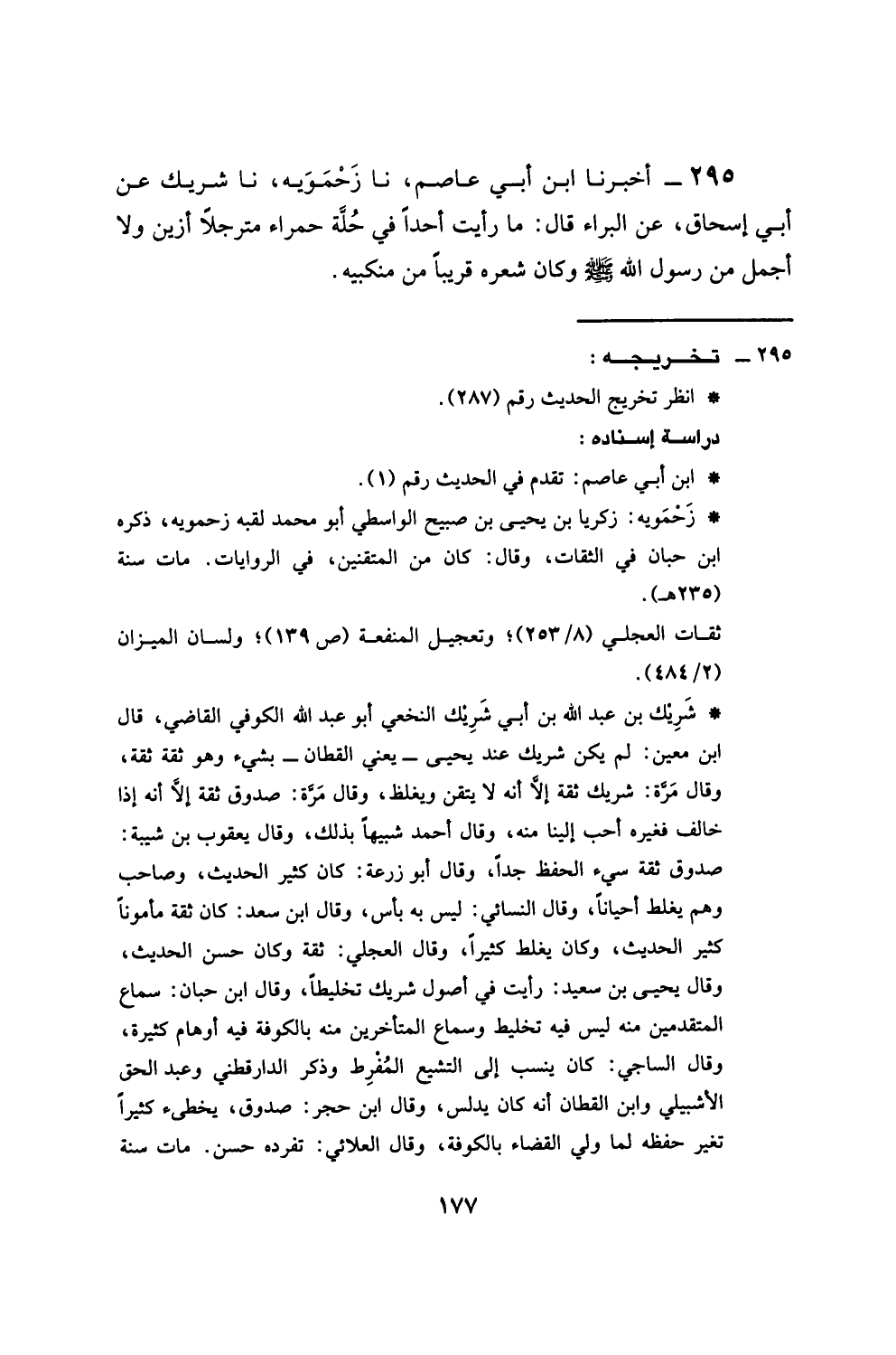 أَخْبَرَنَا ابْنُ أَبِي عَاصِمٍ، نا رَحْمَوَيْهُ، نا شَرِيكٌ، عَنْ أَبِي إِسْحَاقَ، عَنِ الْبَرَاءِ، قَالَ: §مَا رَأَيْتُ أَحَدًا فِي حُلَّةٍ حَمْرَاءَ مُتَرَجِّلًا أَزْيَنَ وَلَا أَجْمَلَ مِنْ رَسُولِ اللَّهِ صَلَّى اللهُ عَلَيْهِ وَسَلَّمَ، وَكَانَ شَعْرُهُ قَرِيبًا مِنْ مَنْكِبَيْهِ