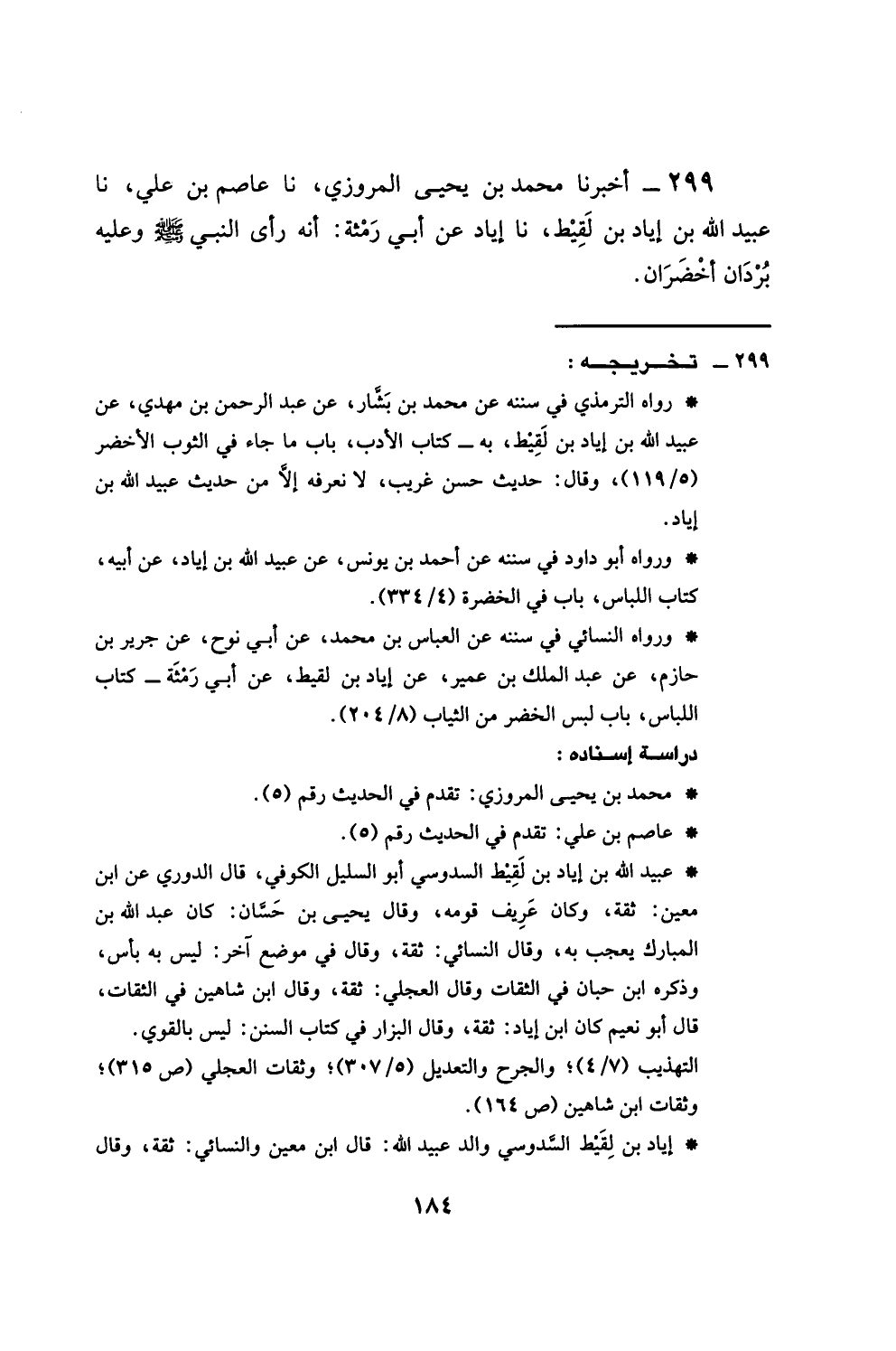 299 - أَخْبَرَنَا مُحَمَّدُ بْنُ يَحْيَى الْمَرْوَزِيُّ، نا عَاصِمُ بْنُ عَلِيٍّ، نا عُبَيْدُ اللَّهِ بْنُ إِيَادِ بْنِ لَقِيطٍ، نا إِيَادٌ، عَنْ أَبِي رِمْثَةَ، أَنَّهُ §رَأَى النَّبِيَّ صَلَّى اللهُ عَلَيْهِ وَسَلَّمَ وَعَلَيْهِ بُرْدَانِ أَخْضَرَانِ