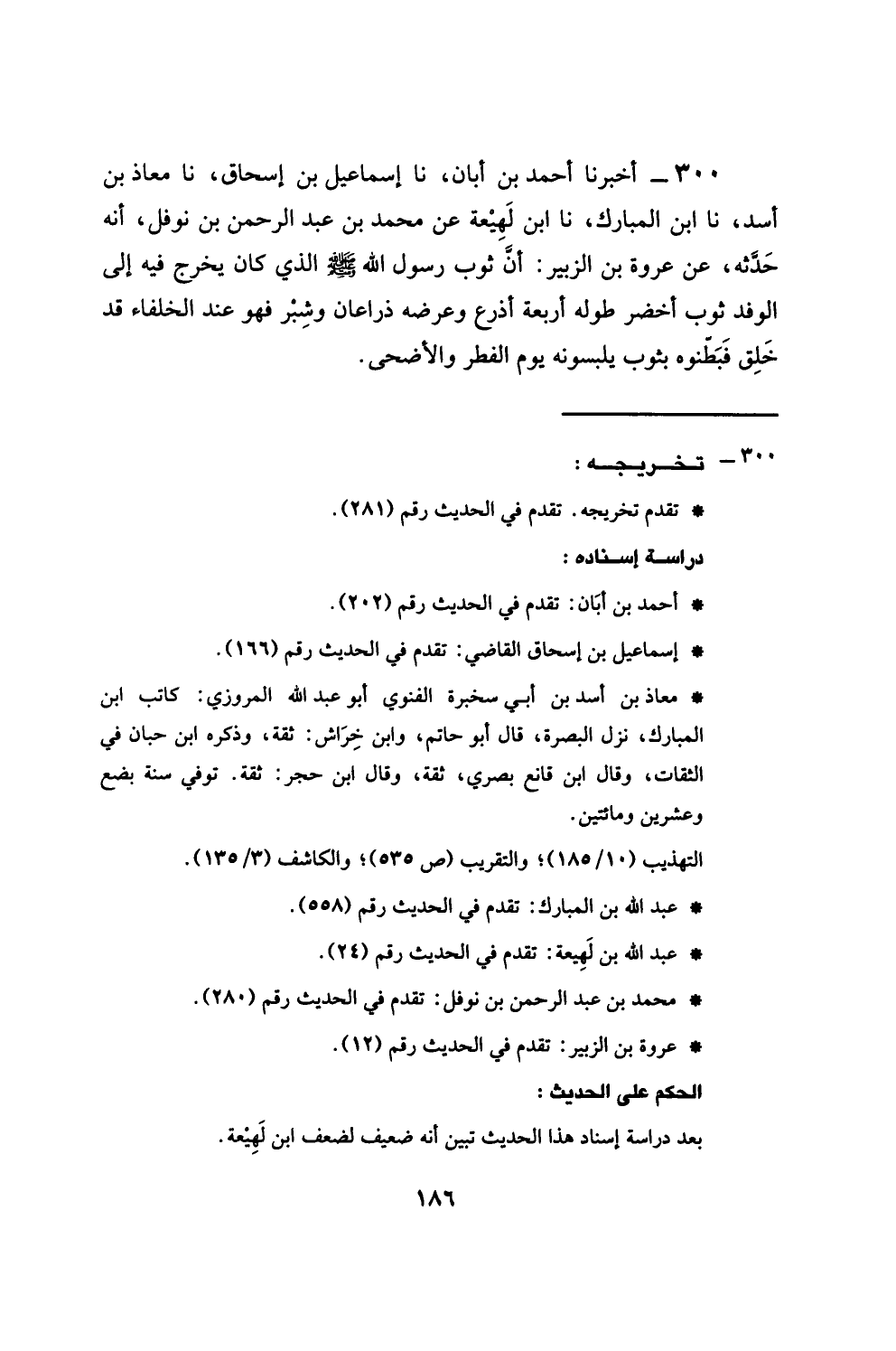 300 - أَخْبَرَنَا أَحْمَدُ بْنُ أَبَانَ، نا إِسْمَاعِيلُ بْنُ إِسْحَاقَ، نا مُعَاذُ بْنُ أَسَدٍ، نا ابْنُ الْمُبَارَكِ، نا ابْنُ لَهِيعَةَ، عَنْ مُحَمَّدِ بْنِ عَبْدِ الرَّحْمَنِ بْنِ نَوْفَلٍ، أَنَّهُ حَدَّثَهُ عَنْ عُرْوَةَ بْنِ الزُّبَيْرِ، §أَنَّ ثَوْبَ رَسُولُ اللَّهِ صَلَّى اللهُ عَلَيْهِ وَسَلَّمَ الَّذِي كَانَ يَخْرُجُ فِيهِ إِلَى الْوَفْدِ ثَوْبٌ أَخْضَرُ طُولُهُ أَرْبَعَةُ أَذْرُعٍ، وَعَرْضُهُ ذِرَاعَانِ وَشِبْرٌ، فَهُوَ عِنْدَ الْخُلَفَاءِ قَدْ خَلُقَ، فَبَطَّنُوهُ بِثَوْبٍ يَلْبَسُونَهُ يَوْمَ الْفِطْرِ وَالْأَضْحَى