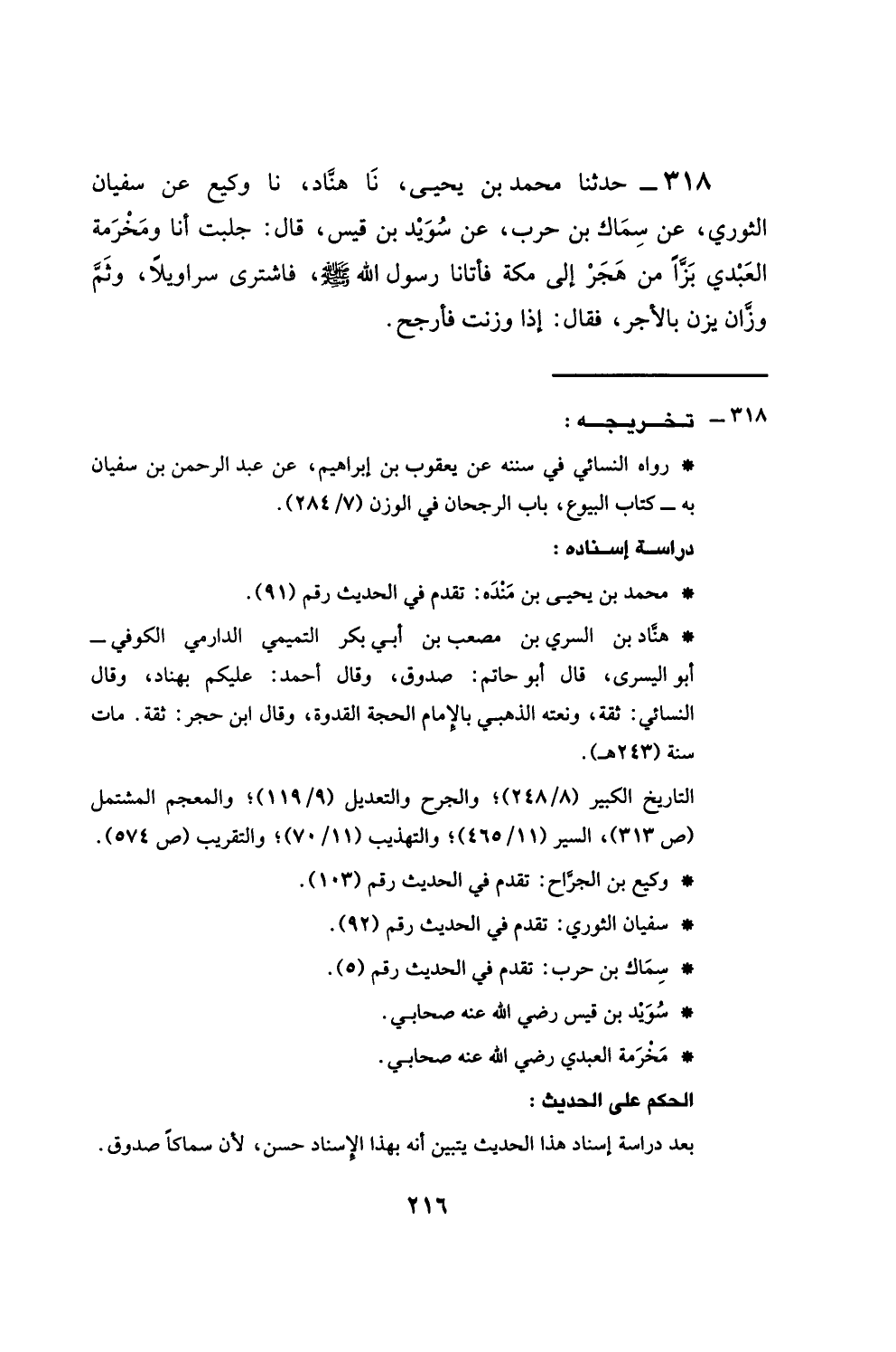 318 - حَدَّثَنَا مُحَمَّدُ بْنُ يَحْيَى، نَا هَنَّادٌ، نَا وَكِيعٌ، عَنْ سُفْيَانَ الثَّوْرِيِّ، عَنْ سِمَاكِ بْنِ حَرْبٍ، عَنْ سُوَيْدِ بْنِ قَيْسٍ، قَالَ: §جَلَبْتُ أَنَا وَمَخْرَمَةُ الْعَبْدِيُّ بَزًّا مِنْ هَجَرَ إِلَى مَكَّةَ، فَأَتَانَا رَسُولُ اللَّهِ صَلَّى اللهُ عَلَيْهِ وَسَلَّمَ، فَاشْتَرَى سَرَاوِيلًا، وَثَمَّ وَزَّانٌ يَزِنُ بِالْأَجْرِ، فَقَالَ: إِذَا وَزَنْتَ فَأَرْجِحْ