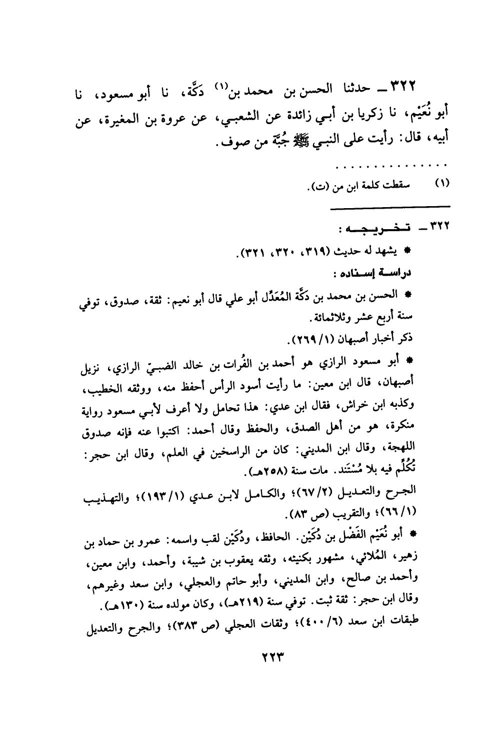 322 - حَدَّثَنَا الْحَسَنُ بْنُ مُحَمَّدِ بْنِ دَكَّةَ، نَا أَبُو مَسْعُودٍ، نَا أَبُو نُعَيْمٍ، نَا زَكَرِيَّا بْنُ أَبِي زَائِدَةَ، عَنِ الشَّعْبِيِّ، عَنْ عُرْوَةَ بْنِ الْمُغِيرَةِ، عَنْ أَبِيهِ، قَالَ: §رَأَيْتُ عَلَى النَّبِيِّ صَلَّى اللهُ عَلَيْهِ وَسَلَّمَ جُبَّةً مِنْ صُوفٍ