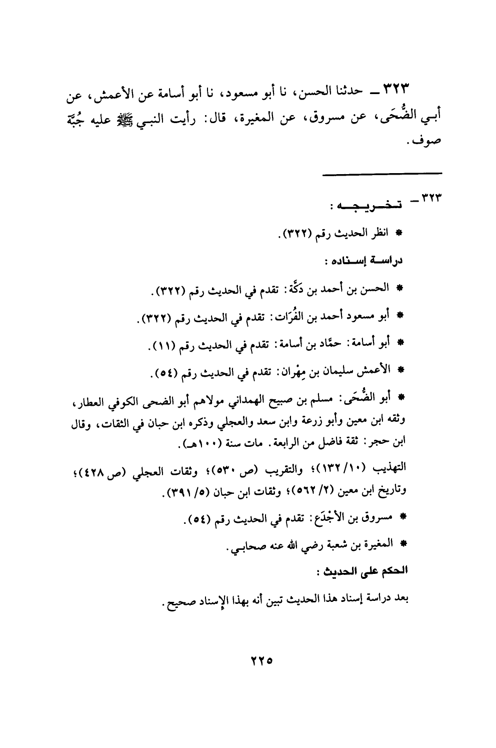 323 - حَدَّثَنَا الْحَسَنُ، نَا أَبُو مَسْعُودٍ، نَا أَبُو أُسَامَةَ، عَنِ الْأَعْمَشِ، عَنْ أَبِي الضُّحَى، عَنْ مَسْرُوقٍ، عَنِ الْمُغِيرَةِ، قَالَ: §رَأَيْتُ النَّبِيَّ صَلَّى اللهُ عَلَيْهِ وَسَلَّمَ عَلَيْهِ جُبَّةُ صُوفٍ