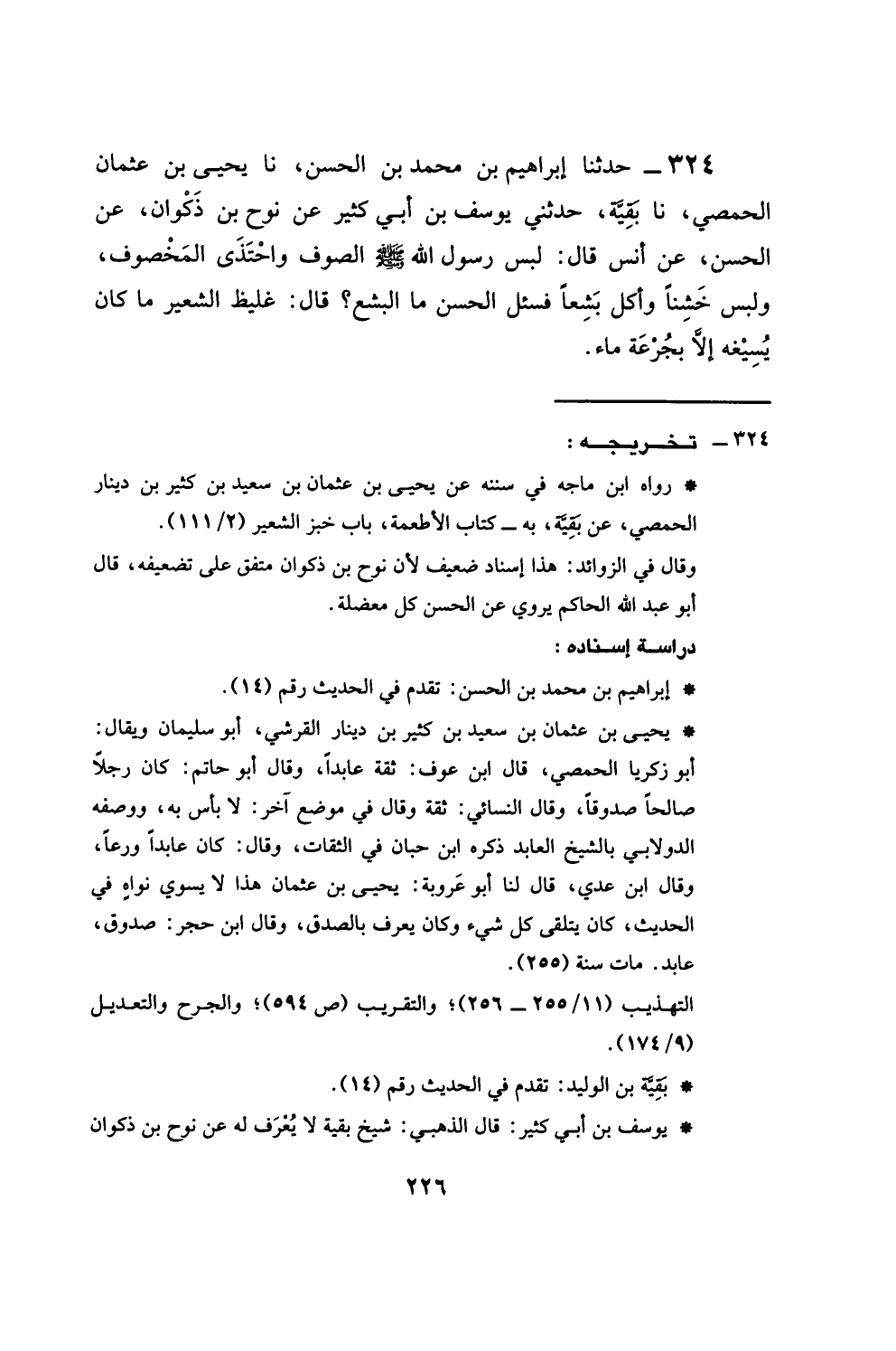 324 - حَدَّثَنَا إِبْرَاهِيمُ بْنُ مُحَمَّدِ بْنِ الْحَسَنِ، نَا يَحْيَى بْنُ عُثْمَانَ الْحِمْصِيُّ، نَا بَقِيَّةُ، حَدَّثَنِي يُوسُفُ بْنُ أَبِي كَثِيرٍ، عَنْ نُوحِ بْنِ ذَكْوَانَ، عَنِ الْحَسَنِ، عَنْ أَنَسٍ، قَالَ: §لَبِسَ رَسُولُ اللَّهِ صَلَّى اللهُ عَلَيْهِ وَسَلَّمَ الصُّوفَ، وَاحْتَذَى الْمَخْصُوفَ وَلَبِسَ خَشِنًا، وَأَكَلَ بَشِعًا. فَسَأَلْتُ الْحَسَنَ: مَا الْبَشِعُ؟ قَالَ: غَلِيظُ الشَّعِيرِ، مَا كَانَ يُسِيغُهُ إِلَّا بِجُرْعَةِ مَاءٍ