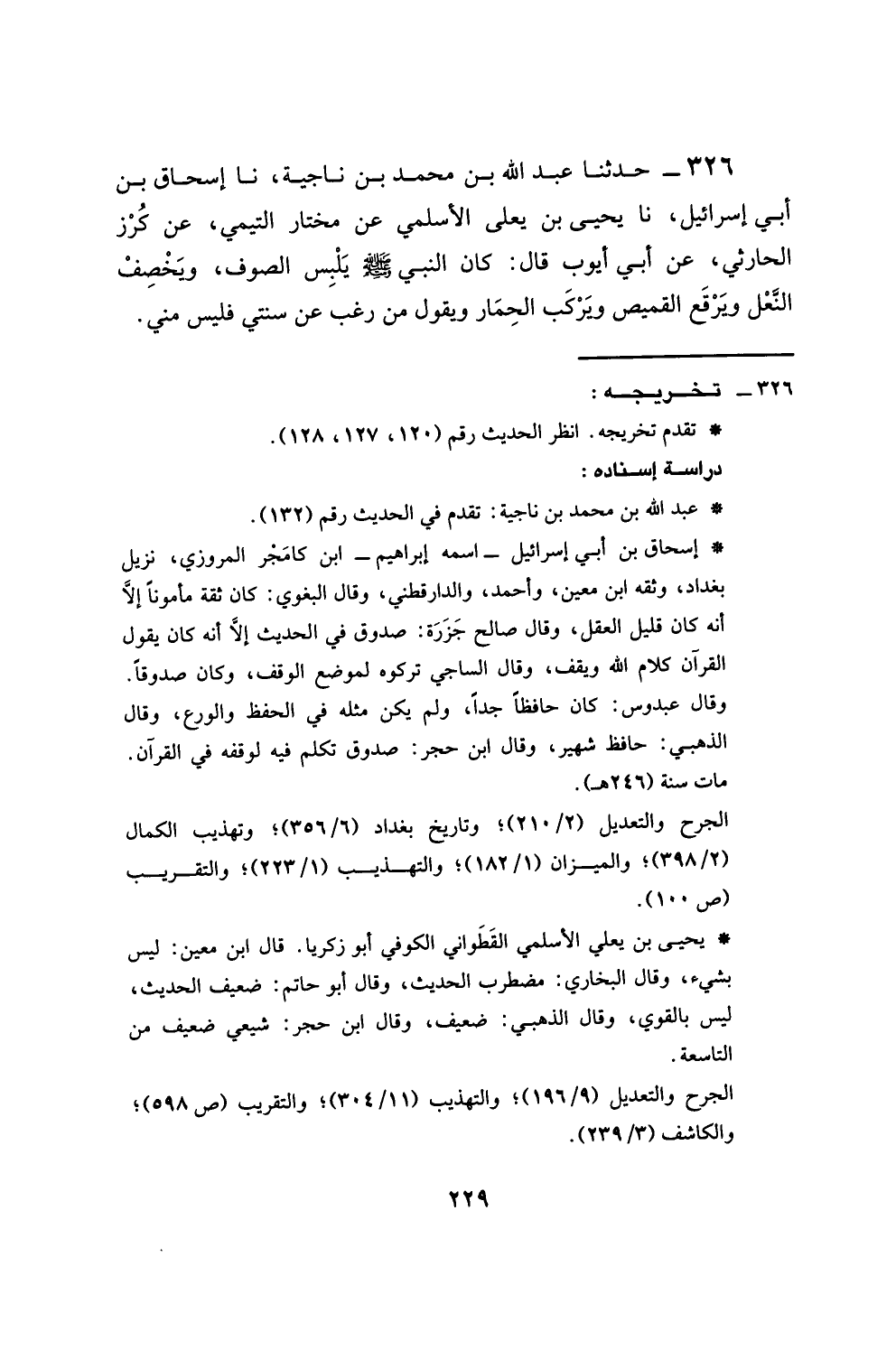 326 - حَدَّثَنَا عَبْدُ اللَّهِ بْنُ مُحَمَّدِ بْنِ نَاجِيَةَ، نَا إِسْحَاقُ بْنُ أَبِي إِسْرَائِيلَ، نَا يَحْيَى بْنُ يَعْلَى السُّلَمِيُّ، عَنْ مُخْتَارٍ التَّيْمِيِّ، عَنْ كُرْزٍ الْحَارِثِيِّ، عَنْ أَبِي أَيُّوبَ، قَالَ: كَانَ رَسُولُ اللَّهِ صَلَّى اللهُ عَلَيْهِ وَسَلَّمَ §يَلْبَسُ الصُّوفَ، وَيَخْصِفُ النَّعْلَ، وَيَرْقَعُ الْقَمِيصَ، وَيَرْكَبُ الْحِمَارَ، وَيَقُولُ: مَنْ رَغِبَ عَنْ سُنَّتِي فَلَيْسَ مِنِّي