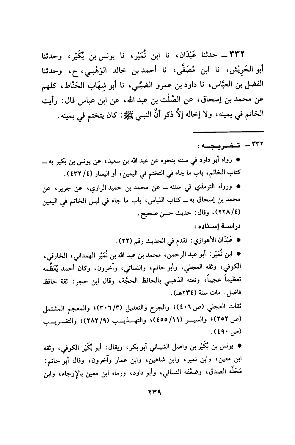 332 - حَدَّثَنَا عَبْدَانُ، نَا ابْنُ نُمَيْرٍ، نَا يُونُسُ بْنُ بُكَيْرٍ. ح. وَحَدَّثَنَا أَبُو الْحَرِيشِ، نَا ابْنُ مُصَفَّى، نَا أَحْمَدُ بْنُ خَالِدٍ الْوَهْبِيُّ. ح. وَحَدَّثَنَا الْفَضْلُ بْنُ الْعَبَّاسِ، نَا دَاودُ بْنُ عَمْرٍو الضَّبِّيُّ، نَا أَبُو شِهَابٍ الْحَنَّاطُ، كُلُّهُمْ عَنْ مُحَمَّدِ بْنِ إِسْحَاقَ، عَنِ الصَّلْتِ بْنِ عَبْدِ اللَّهِ، عَنِ ابْنِ عَبَّاسٍ، قَالَ: §رَأَيْتُ الْخَاتَمَ فِي يَمِينِهِ، وَلَا إِخَالُهُ إِلَّا ذَكَرَ: أَنَّ النَّبِيَّ صَلَّى اللهُ عَلَيْهِ وَسَلَّمَ كَانَ يَتَخَتَّمُ فِي يَمِينِهِ