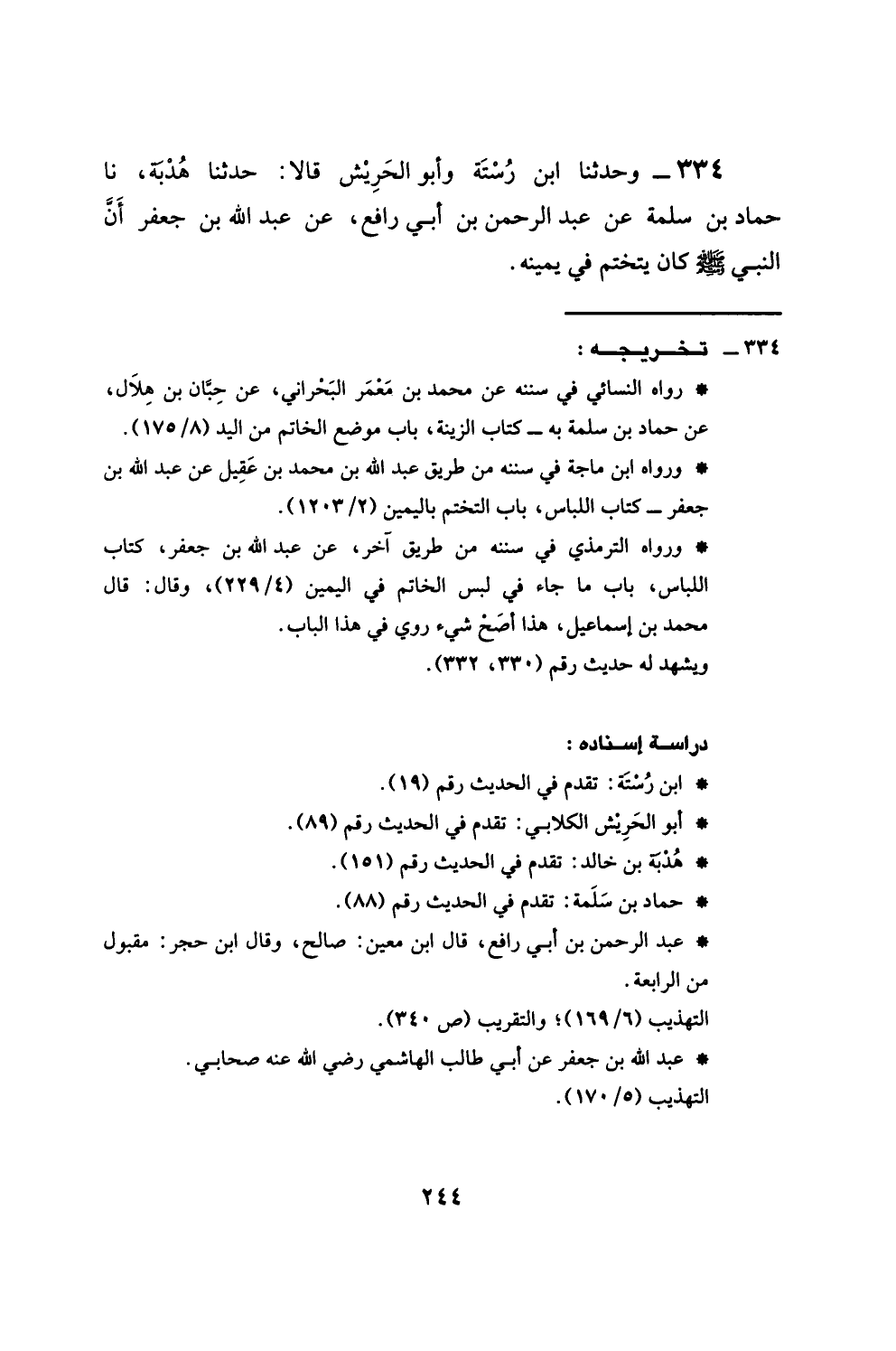 334 - وَحَدَّثَنَا ابْنُ رُسْتَةَ، وَأَبُو الْحَرِيشِ، قَالَا: حَدَّثَنَا هُدْبَةُ، نَا حَمَّادُ بْنُ سَلَمَةَ، عَنْ عَبْدِ الرَّحْمَنِ بْنِ أَبِي رَافِعٍ، وَعَنْ عَبْدِ اللَّهِ بْنِ جَعْفَرٍ، أَنَّ النَّبِيَّ صَلَّى اللهُ عَلَيْهِ وَسَلَّمَ كَانَ §يَتَخَتَّمُ فِي يَمِينِهِ